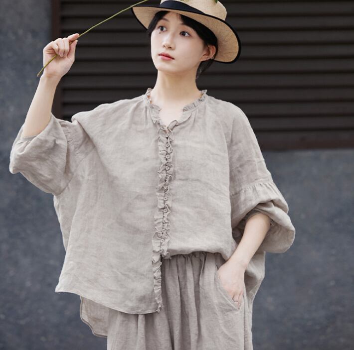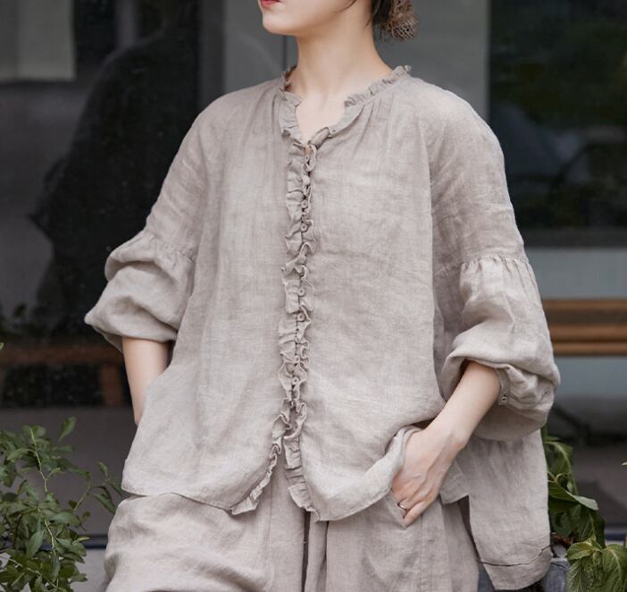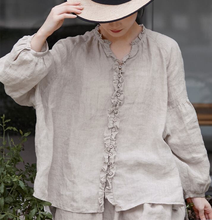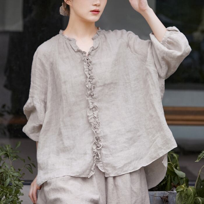 レディース トップス シャツ 前開き 普通丈 長袖 クルーネック 襟なし ワイド 裾ワイド 薄手 リネン 麻 シンプル カジュアル おしゃれ レトロ アジアン こなれ感 ラフ ルーズ 個性的 クール モダン 主役級 存在感 都会的 ベーシック ナチュラル 無地 春 夏 ロングシーズン デート お出かけ 旅行 公園 女子会 休日 ショッピング カフェ コーデ 楽ちん 体型カバー 普段使い 着回し モテ 清楚 トレンド 流行 インスタ映え 定番 M L ゆったり ベーシックカラー 大人カラー