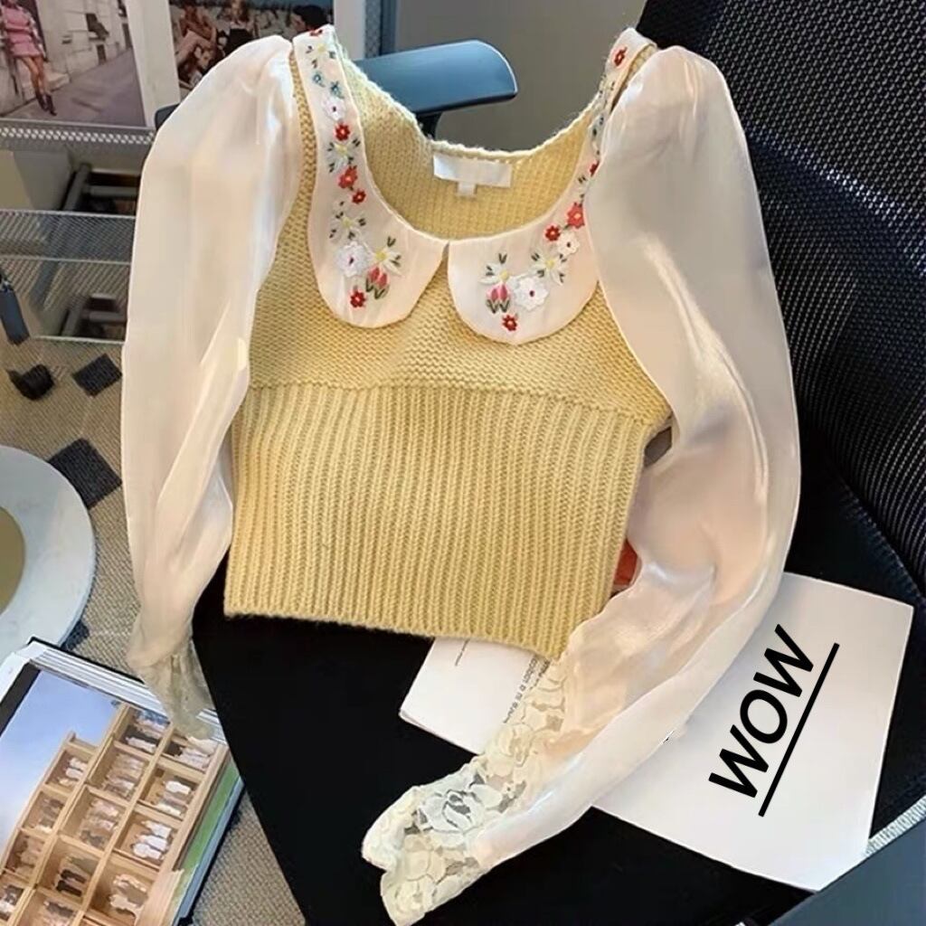 レディース トップス ニット セーター 長袖 ボリューム袖 Uネック ラウンドネック 襟付き 丸襟 フェミニン 刺繍 ハイウエスト 透け感 シースルー 異素材ミックス かわいい 大人可愛い きれいめ 上品 おしゃれ レトロ ガーリー エレガント ヴィンテージ ラブリー キュート ロリータ プリンセス クラシカル ロマンティック 花柄 フラワー デート お出かけ イベント レストラン 休日 コンサート ライブ 韓国 オルチャン 普段使い 着回し トレンド 流行 インスタ映え フリーサイズ 黄色 イエロー