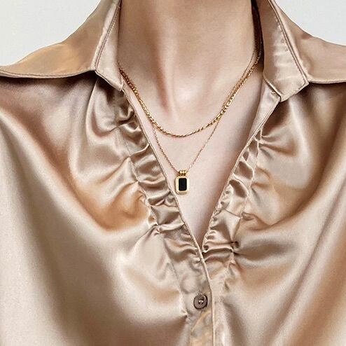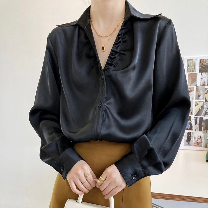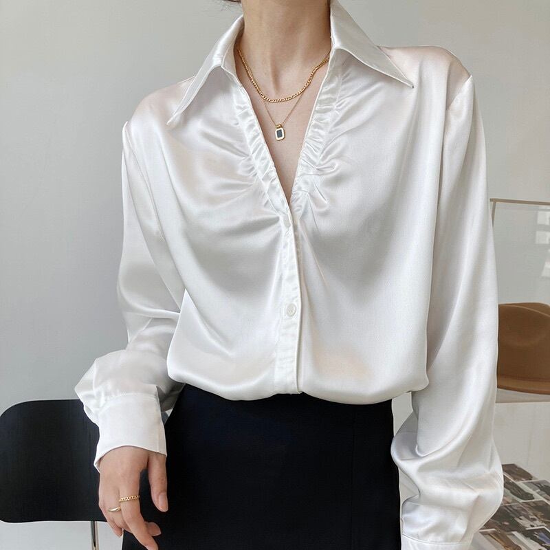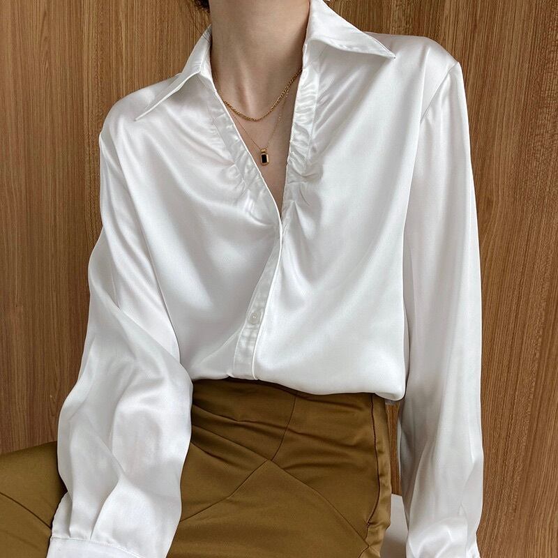 レディース トップス シャツ ブラウス 長袖 Vネック 襟付き 角襟 フェミニン タック タックプリーツ サテン かわいい 大人可愛い きれいめ シンプル 上品 おしゃれ かっこいい ガーリー クール エレガント モダン 存在感 とろみ感 抜け感 かっちり ヴィンテージ ラブリー キュート 都会的 ラグジュアリー クラシカル ベーシック ロマンティック ナチュラル 無地 春 秋 お出かけ レストラン 休日 重ね着 普段使い 着回し レイヤード 清楚 定番 S M L 白 ホワイト 黒 ブラック ベージュ