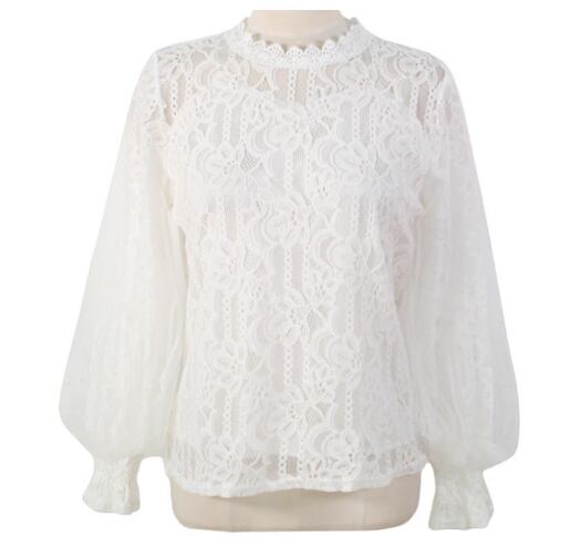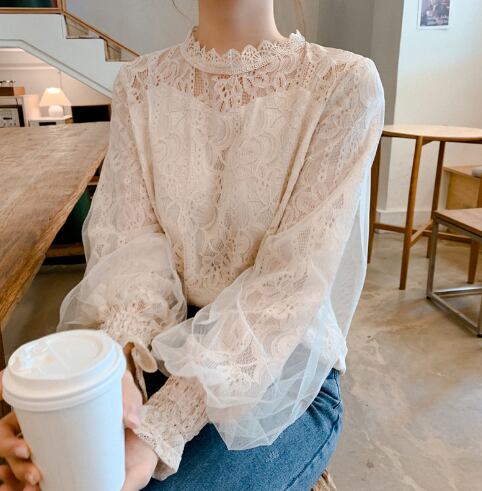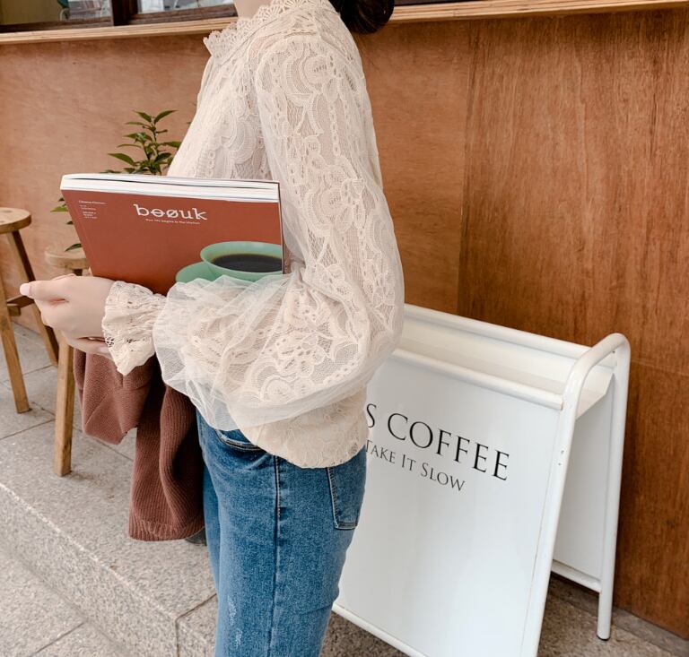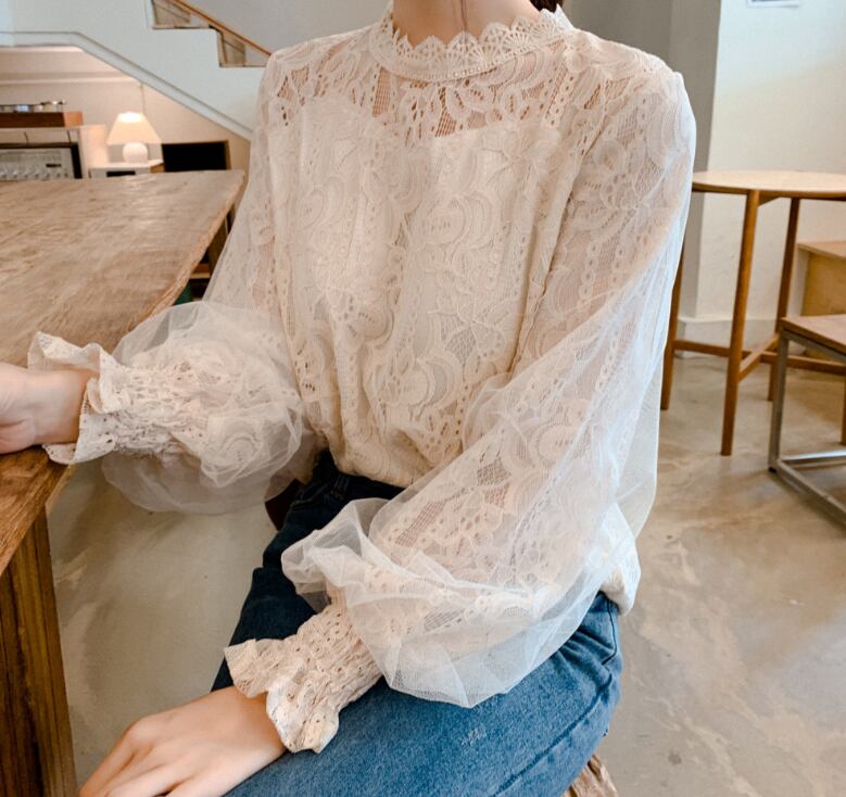繊細なレースがフェミニンさを引き立てる、襟なし長袖ブラウス。