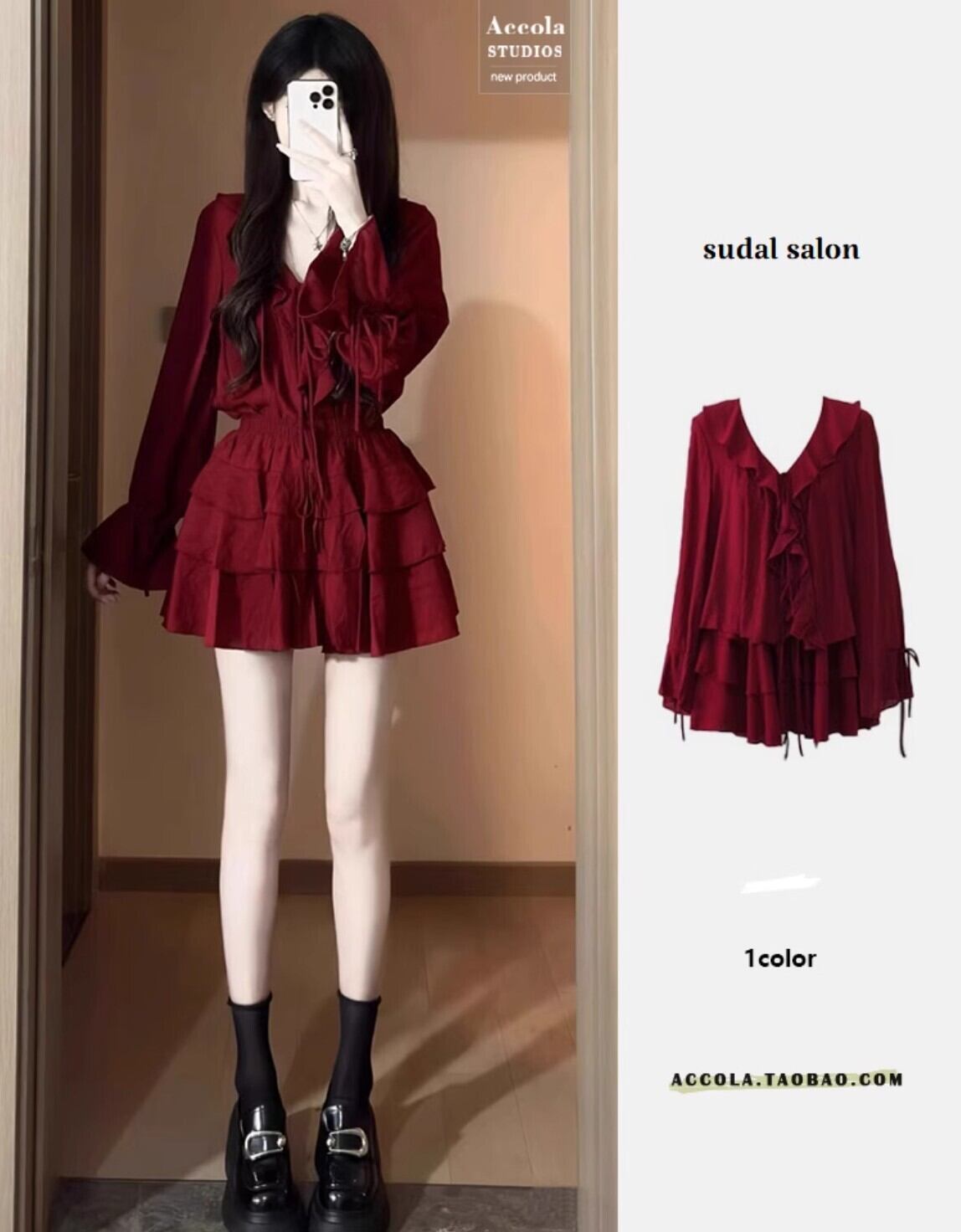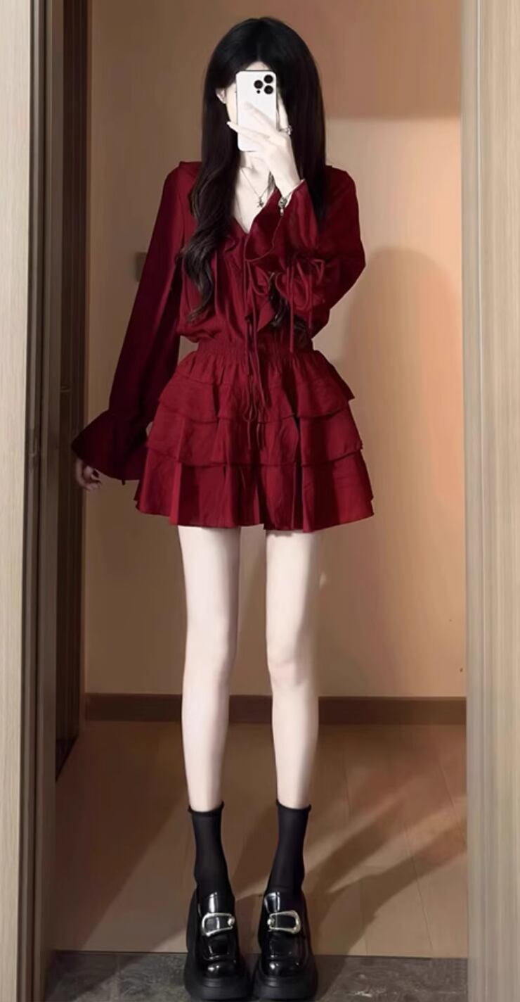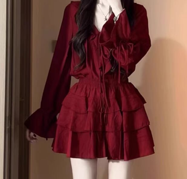 レディース スカート トップス ワンピース チュニック オールインワン ミニワンピ フレア ティアード ギャザースカート ショートスカート フレアスカート ミニスカート ミニ ショート ショート丈 長袖 フレアスリーブ フリル袖 Vネック りぼんタイ フレア スリム 細身 ティアード フェミニン フリル リボン ハイウエスト 編み上げ レースアップ かわいい 大人可愛い カジュアル 無地 春 夏 秋 冬 レディース お出かけ S M L XL サイズ展開 レッド ワインレッド 大人カラー 秋カラー