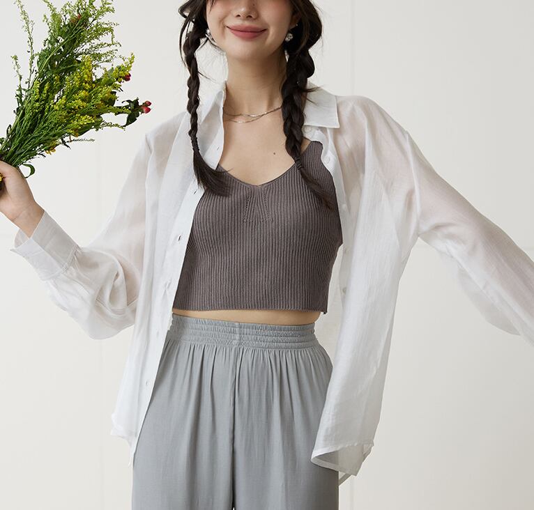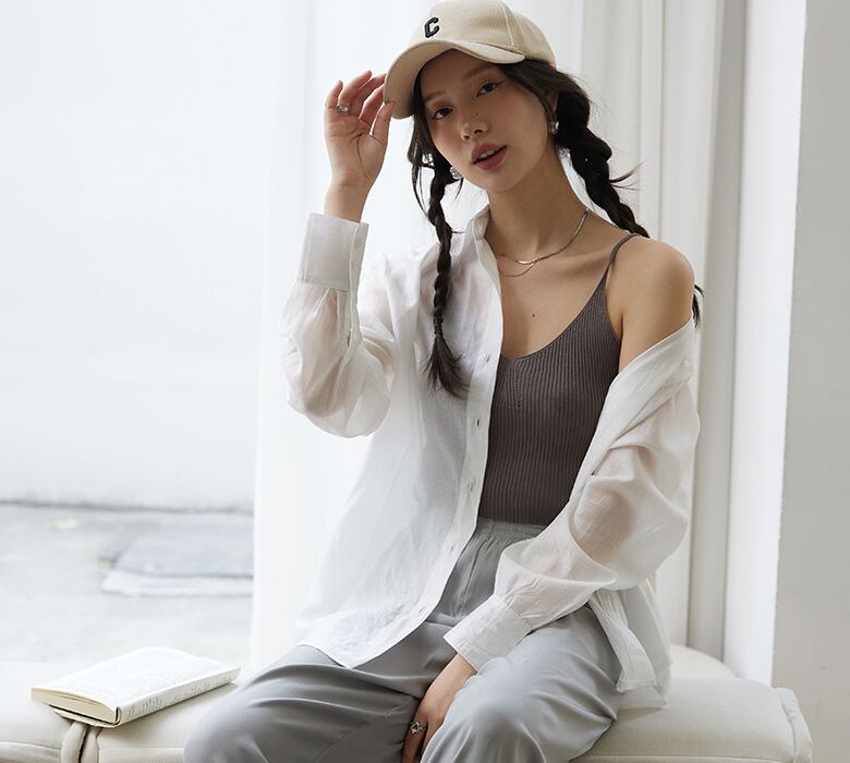 無地のシンプルデザインは、春夏の重ね着やリゾート・旅行コーデにも大活躍。
