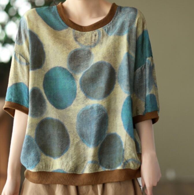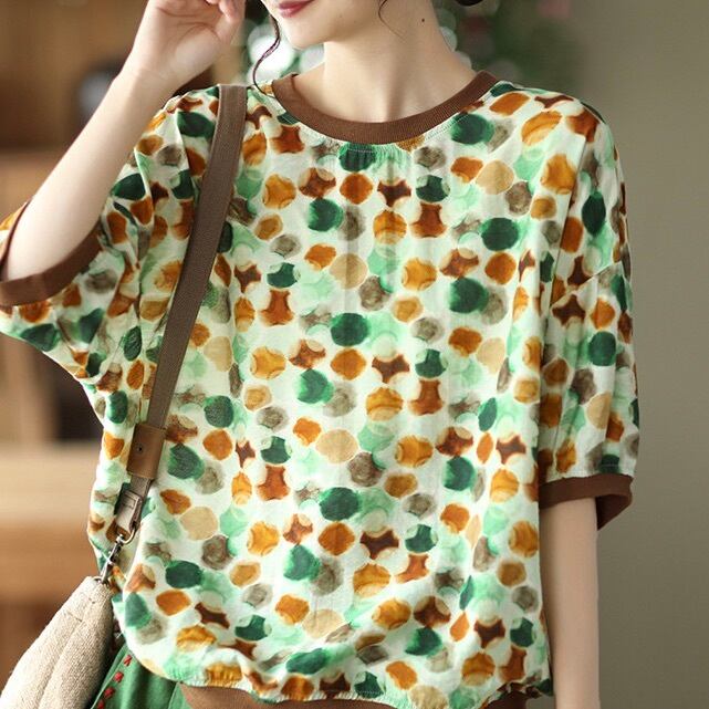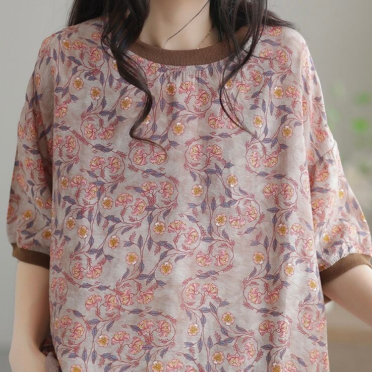 レディース トップス カットソー Tシャツ 半袖 Uネック ラウンドネック リネン 綿 麻 かわいい 大人可愛い カジュアル 上品 おしゃれ かっこいい レトロ アジアン エスニック エキゾチック こなれ感 抜け感 ラブリー キュート プレッピー アクティブ ナチュラル 花柄 フラワー ドット柄 水玉 リーフ ボタニカル プリント 総柄 夏 アウトドア キャンプ 休日 バカンス 韓国 オルチャン 着回し トレンド 流行 インスタ映え 紫 茶色 グレー オレンジ レッド 緑 グリーン パープル カラバリ 赤