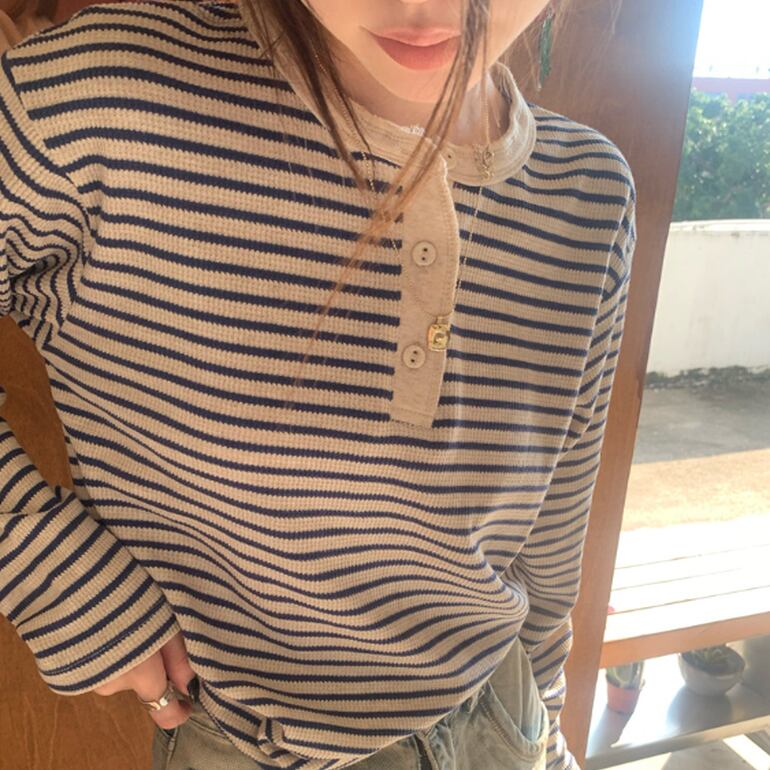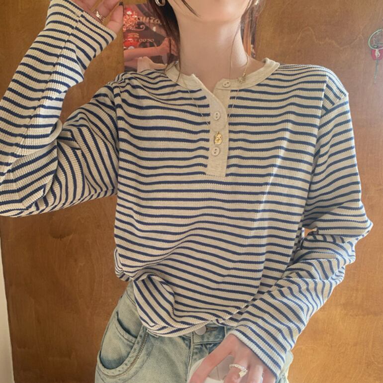 トップス ロンT カットソー プルオーバー ボーダー 長袖 萌袖 ラウンドネック ボタン アメカジ かわいい 大人可愛い きれいめ シンプル カジュアル 上品 おしゃれ かっこいい レトロ こなれ感 ラフ メンズライク ガーリー エレガント 都会的 クラシカル ベーシック カントリー ナチュラル ボーダー ストライプ 春 夏 秋 ロングシーズン デート お出かけ アウトドア キャンプ 公園 女子会 休日 バカンス ショッピング お花見 カフェ お揃い 普段使い 着回し モテ 定番 ワンサイズ 大人カラー