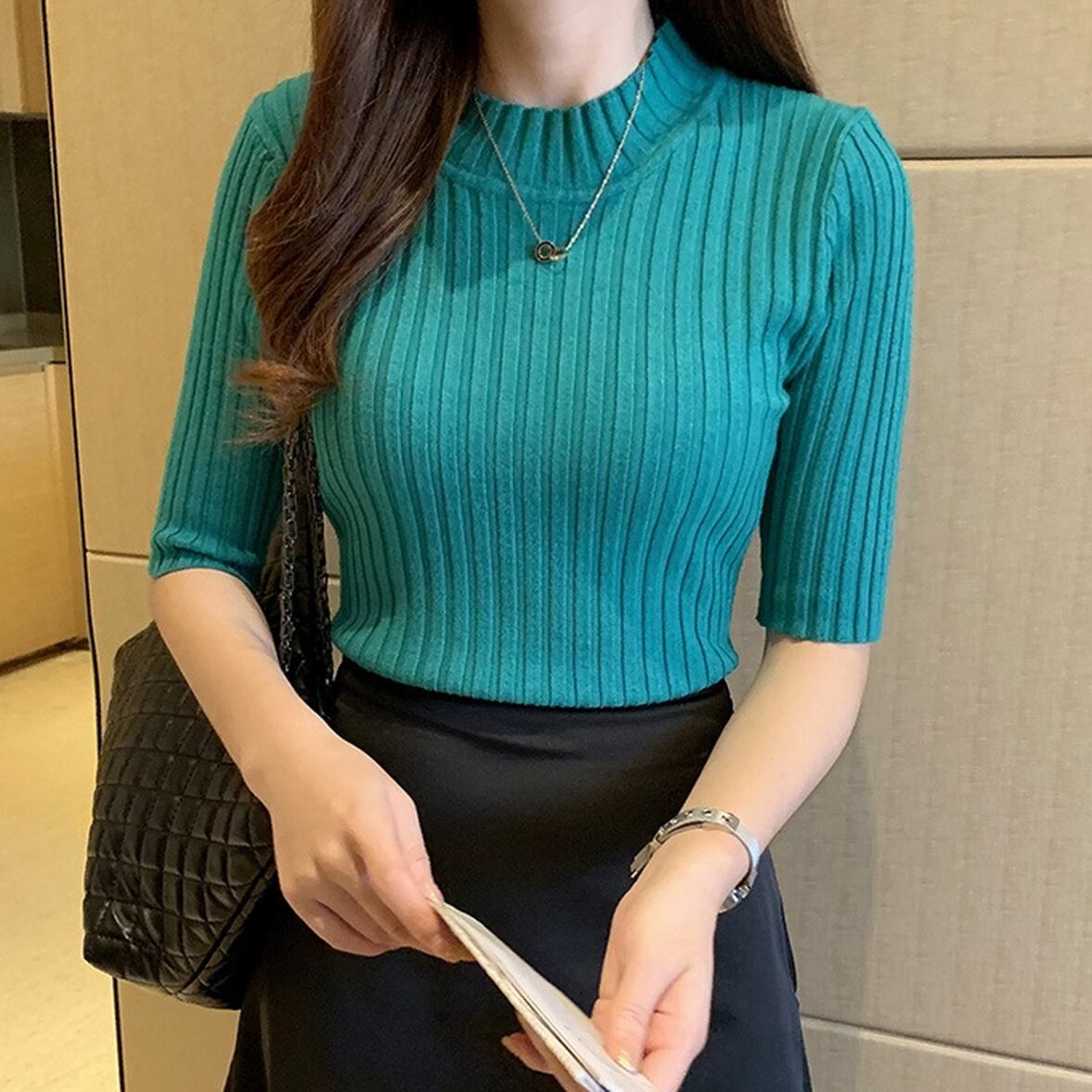 ハーフスリーブリブニット トップス ニット カットソー リブニット ハーフ袖ニット リブカットソー リブニットソー 5分袖 ハーフスリーブ クルーネック リブ編み スマート スリム 伸縮性 無地 オフィス レディース かわいい 大人可愛い おしゃれ ガーリー エレガント 主役級 存在感 キュート きれいめ 上品 シンプル ベーシック カジュアル お出かけ ショッピング 休日 通勤 通学 デート 女子会 イベント 旅行 体型カバー ゆったり フェミニン