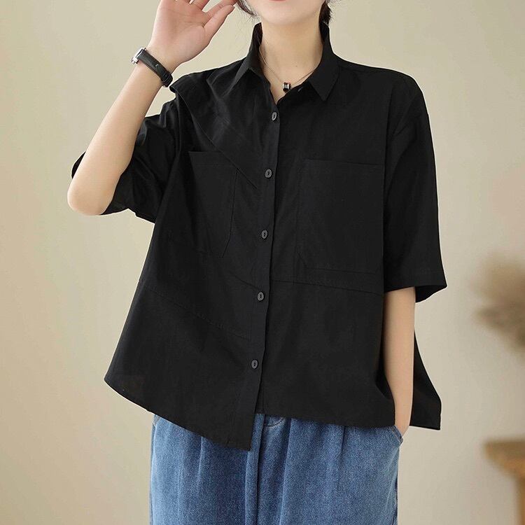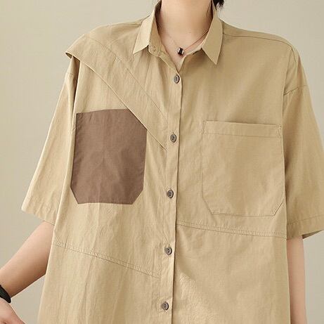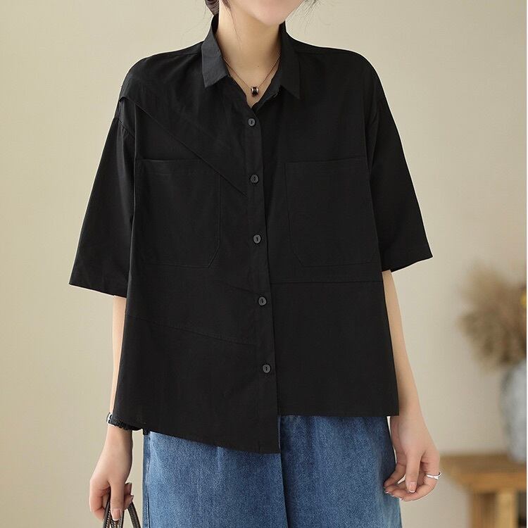 レディース トップス シャツ ブラウス アシンメトリー 半袖 5分袖 Vネック 襟付き 角襟 ストリート 切り替えデザイン 配色 ドッキング かわいい 大人可愛い カジュアル おしゃれ かっこいい ラフ メンズライク マニッシュ ボーイッシュ ルーズ 個性的 クール 存在感 抜け感 ヴィンテージ アクティブ 無地 夏 アウトドア イベント リゾート 休日 韓国 オルチャン 楽ちん 普段使い トレンド 流行 インスタ映え M L XL 2XL 白 ホワイト ブラック 紫 オフホワイト ベージュ バイカラー