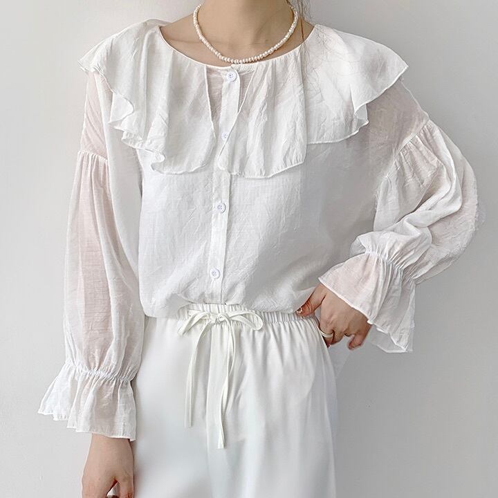レディース トップス シャツ ブラウス 長袖 ボリューム袖 フリル袖 バルーン袖 ビッグ襟 大きい襟 フェミニン フリル 前開き ボタン かわいい 大人可愛い きれいめ 上品 おしゃれ こなれ感 ガーリー エレガント モダン 主役級 存在感 ヴィンテージ ラブリー キュート ロリータ プリンセス ラグジュアリー クラシカル ロマンティック 無地 春 秋 デート お出かけ レストラン 休日 普段使い 着回し トレンド 流行 インスタ映え フリーサイズ 白 ホワイト 黒 ブラック 茶色 ブラウン オレンジ