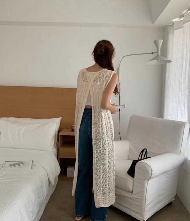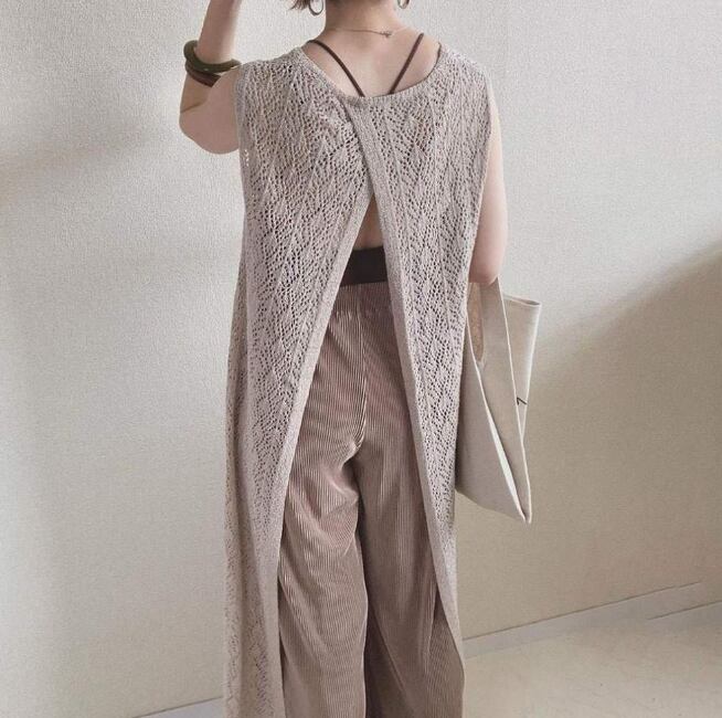 大人の抜け感を演出する、背中開きデザインのロングベスト。