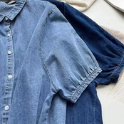 レディース トップス シャツ ブラウス 5分袖 ボリューム袖 バルーン袖 襟付き 角襟 フェミニン ストリート ポケット 前開き デニム ブルーデニム かわいい 大人可愛い きれいめ シンプル おしゃれ こなれ感 ラフ ガーリー 抜け感 ヴィンテージ ラブリー キュート ベーシック アクティブ ロマンティック ナチュラル 無地 夏 学生 休日 フェス 重ね着 韓国 オルチャン 普段使い 着回し レイヤード トレンド 流行 M L XL 2XL 3XL 大きいサイズ ビッグ ゆったり 水色 ブルー ネイビー