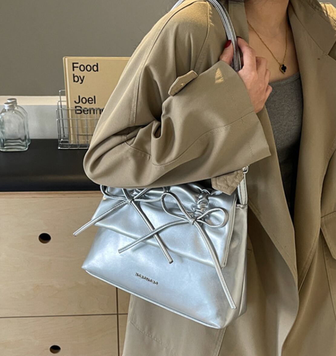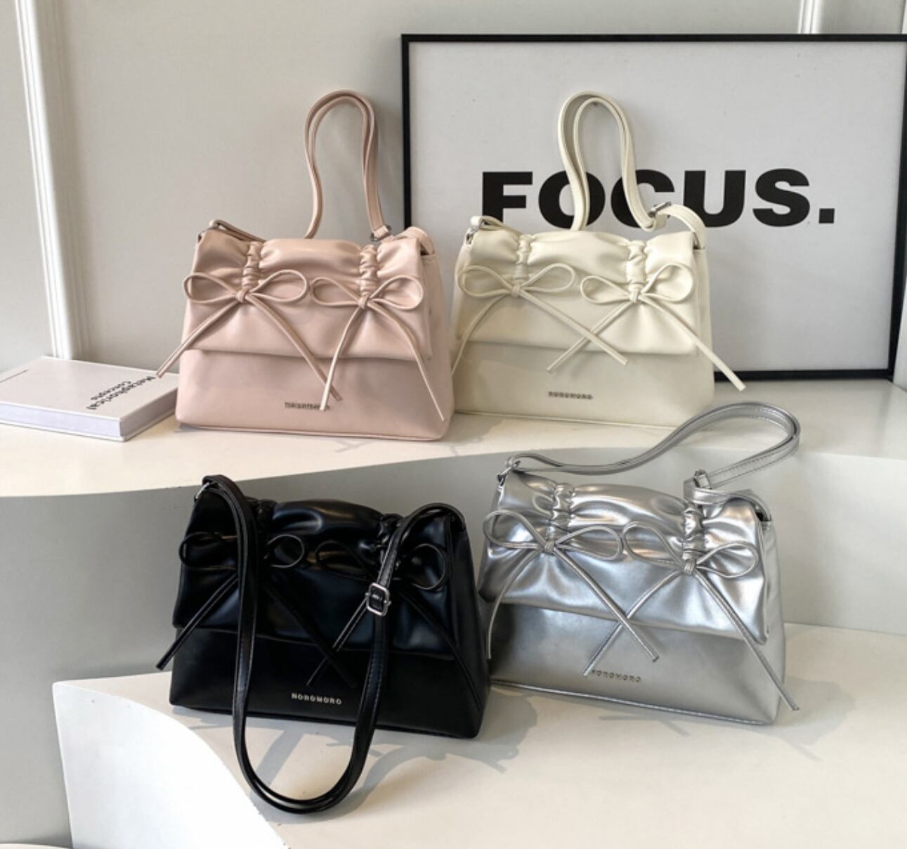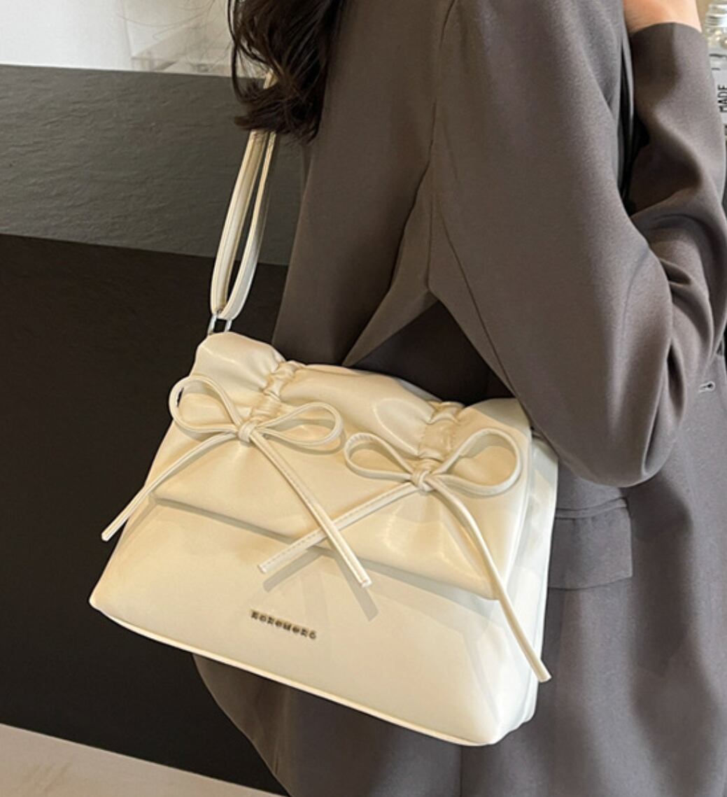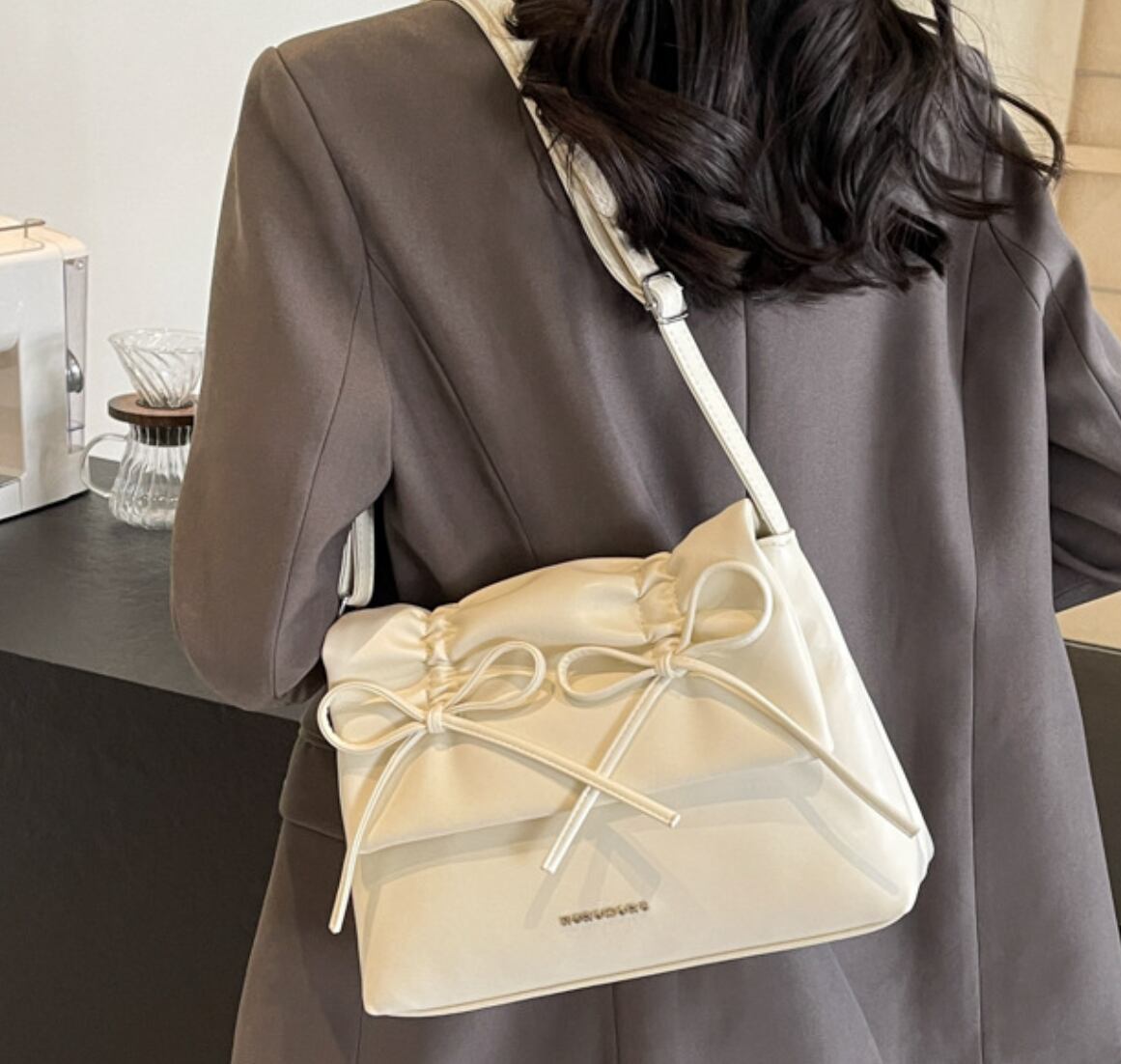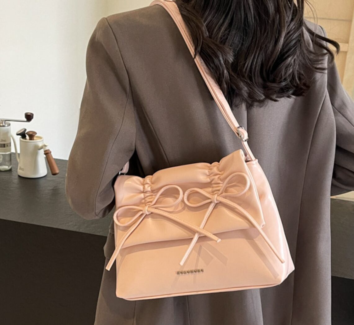 大人可愛い魅力満載のレディースショルダーバッグです。コンパクトなスクエアデザインは、カジュアルからガーリーまで、さまざまなスタイルにマッチします。ダブルリボンとタックが施されたこのバッグは、シンプルながらも高見えするため、特別な日のお出掛けや女子会、カフェでのひとときにぴったりです。