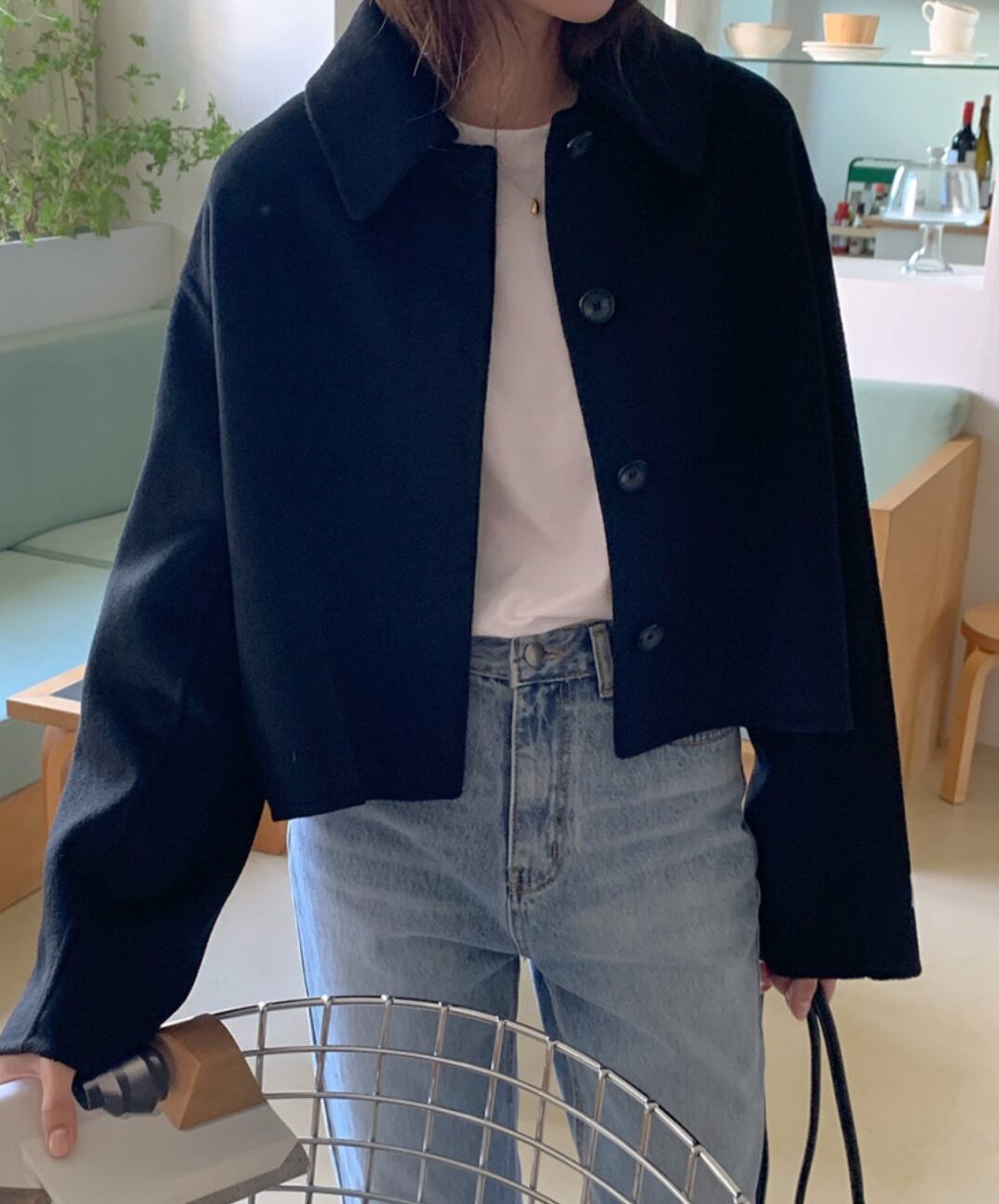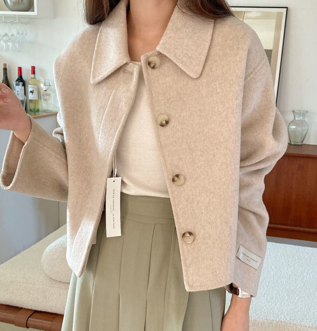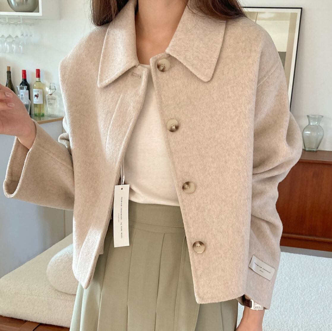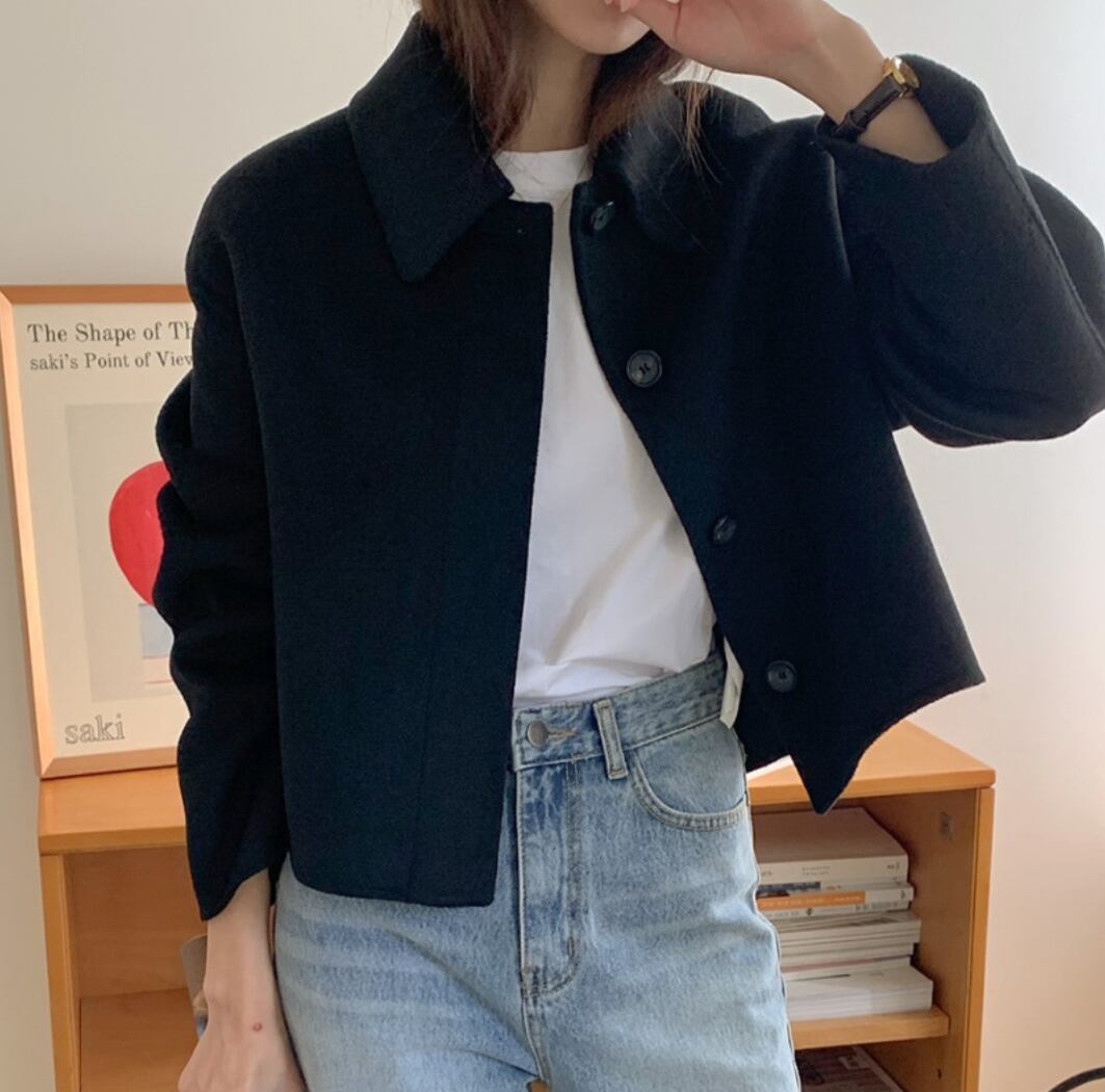 スタイリッシュなウール素材のショートジャケットです。長めの袖のデザインが女性らしさを引き立て、ややワイドシルエットはリラックス感と上品さを両立させています。前開きのボタン仕様で、カジュアルにもフォーマルにもコーディネートしやすい一枚。仕事の通勤からお出かけ、女子会まで幅広くご使用いただけます。シンプルな無地デザインは着回しの幅を広げ、冬のコーディネートに欠かせないアイテムです。