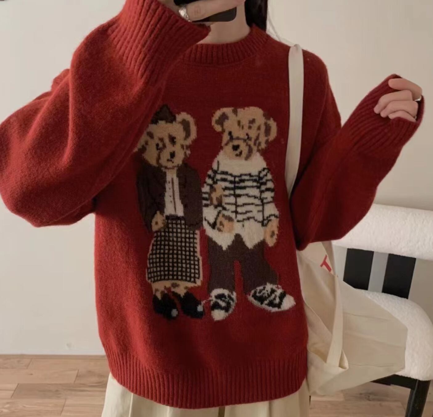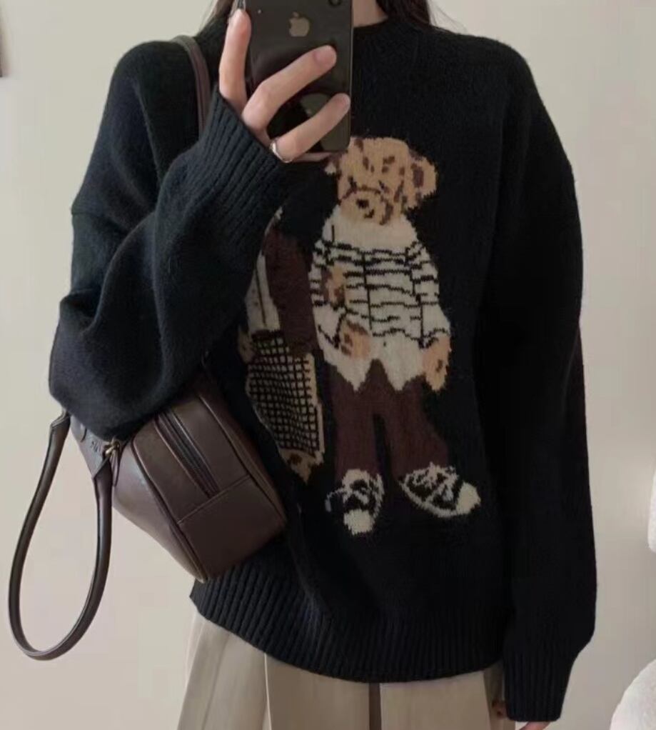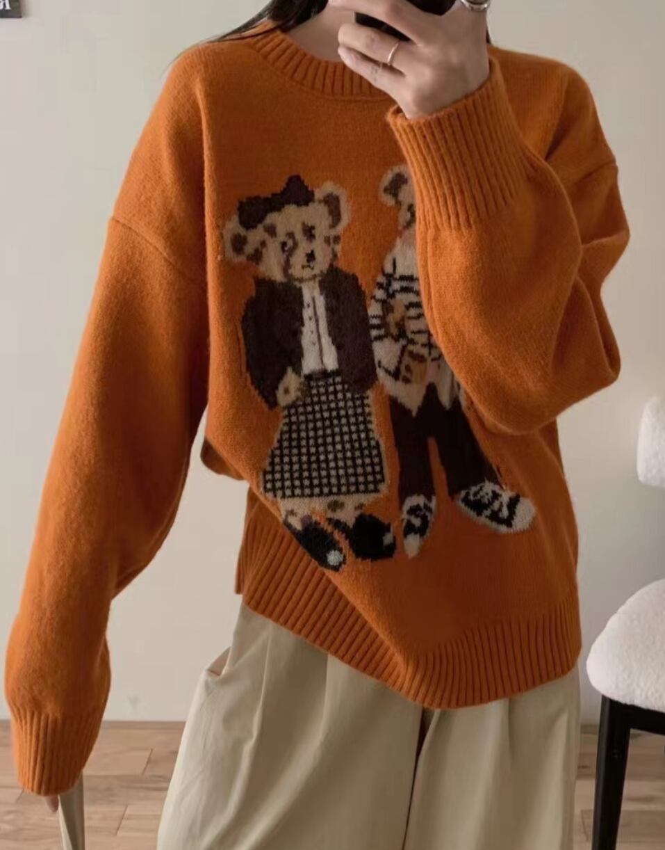 レディース トップス ニット セーター プルオーバー 上着 普通丈 長袖 萌袖 ラウンドネック ストレート ふっくら リブ ニット かわいい 大人可愛い カジュアル レトロ ガーリー ラブリー キュート アメリカン くま柄 アニマル柄 キャラクター 秋 冬 クリスマス バレンタイン 暖かい 10代 20代 学生 デート お出かけ アウトドア パーティー イベント コーデ 楽ちん 暖かい 防寒 体型カバー 普段使い ゆったり ワンサイズ ホワイト ブラック グレー オレンジ レッド ネイビー カラバリ