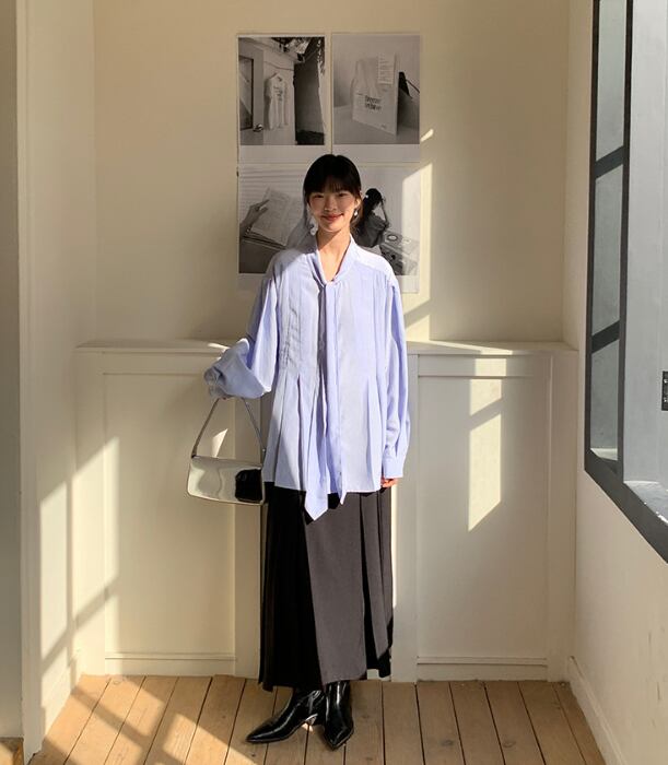 練されたボウタイデザインが目を惹く、長袖ブラウス。
