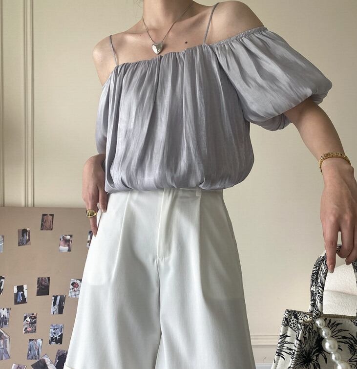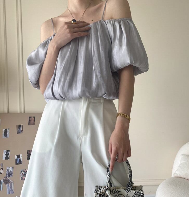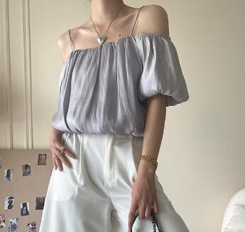 レディース トップス ショート丈 半袖 バルーン袖 キャミソール オフショルダー デコルテ綺麗 ワイド フェミニン きれいめ シンプル カジュアル おしゃれ こなれ感 ラフ クール モード系 エレガント モダン 主役級 存在感 抜け感 都会的 ベーシック ナチュラル 無地 セクシー 夏 デート お出かけ イベント 女子会 ショッピング カフェ コーデ 普段使い 着回し モテ 清楚 トレンド 流行 インスタ映え 定番 S M L サイズ展開 ホワイト グレー ベーシックカラー 大人カラー カラバリ