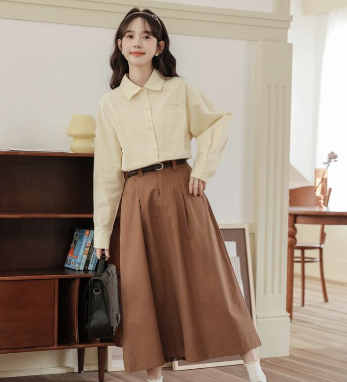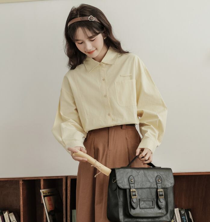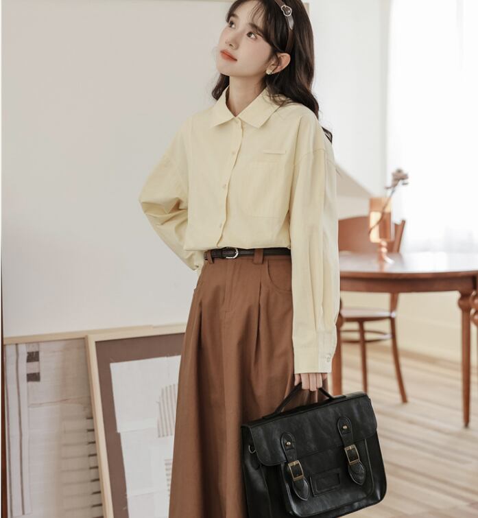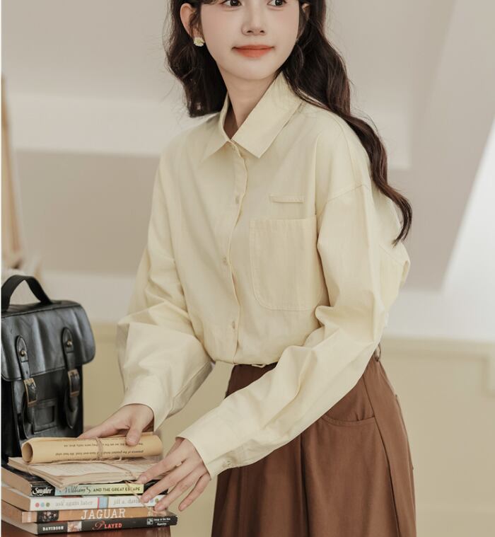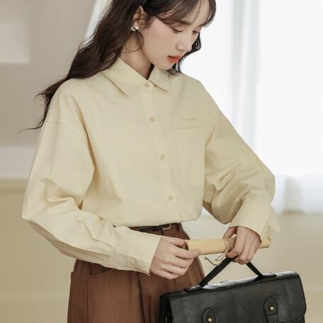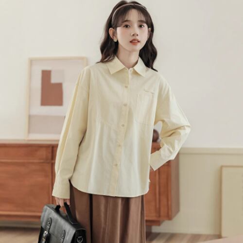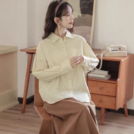 角襟×前開きデザインがレトロなムードを演出する長袖シャツ。