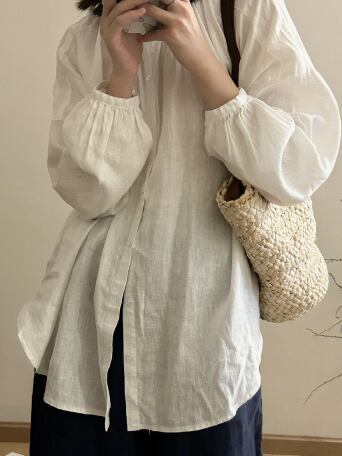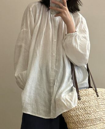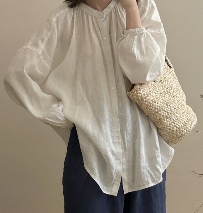 レディース トップス シャツ ブラウス 長袖 クルーネック 襟なし ワイド 前開き ボタン 薄手 きれいめ シンプル カジュアル 上品 おしゃれ レトロ アジアン こなれ感 ラフ 個性的 モダン 主役級 存在感 都会的 ベーシック ナチュラル 無地 春 夏 ロングシーズン デート お出かけ 旅行 女子会 休日 ショッピング カフェ モノトーン 普段使い 着回し モテ 清楚 トレンド 流行 インスタ映え 定番 M L XL 2XL ゆったり サイズ展開 白 ホワイト ベーシックカラー 大人カラー