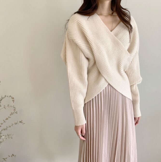 クロスホルターデザインでデコルテを美しく魅せる大人のニット。