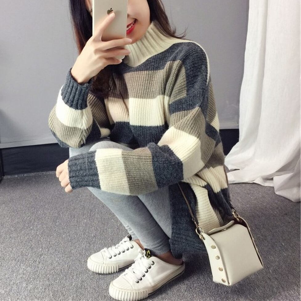 シックな雰囲気の大人っぽいボーダー柄、ストンとしたストレートのヒップまで隠れる丈感、ゆるっとしたリラックス感のあるドロップショルダー、ワイドなゆる感をさりげなくプラスするハイネック、リブニットのチュニックプルオーバーです。