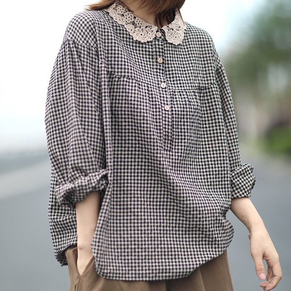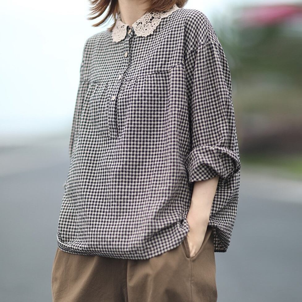 ベースのほんのりくすみカラーがレトロな雰囲気でまとめたチェック柄、小ぶりのレース襟が可愛いゆったりしたシルエットのシャツブラウス。