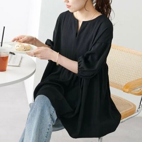 ゆるっと着こなす7分袖のキーネックチュニック。