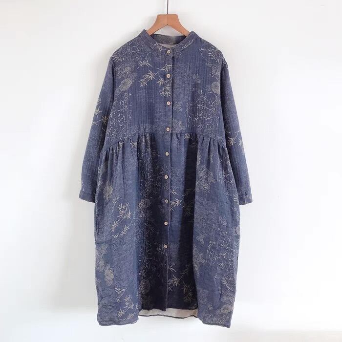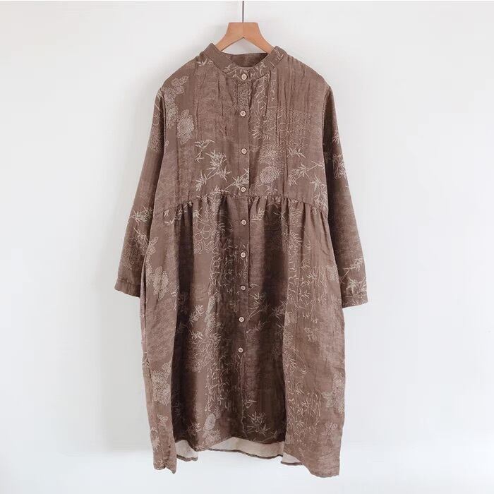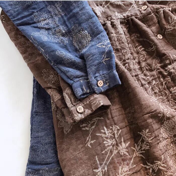 レディース ワンピース シャツ ブラウス ロング 長袖 Uネック ラウンドネック 前開き ボタン カジュアル 上品 レトロ アジアン エスニック エキゾチック こなれ感 ラフ ルーズ 抜け感 プレッピー カントリー ナチュラル ワイルド 花柄 フラワー リーフ ボタニカル 春 秋 お出かけ アウトドア キャンプ イベント リゾート 旅行 公園 女子会 休日 フェス 重ね着 楽ちん 体型カバー 普段使い 着回し トレンド 流行 インスタ映え ゆったり ゆる フリーサイズ 茶色 ブラウン くすみ ネイビー