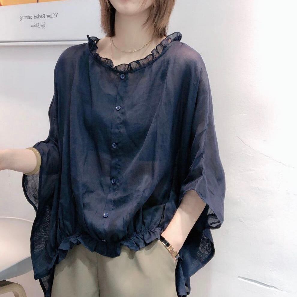 レディース トップス シャツ ブラウス 7分袖 ラウンドネック フェミニン フリル 透け感 シースルー ボタン ヴィンテージ かわいい 大人可愛い きれいめ シンプル おしゃれ こなれ感 ガーリー 抜け感 ラブリー キュート クラシカル ベーシック アクティブ ロマンティック ナチュラル 無地 春 夏 お出かけ イベント リゾート ビーチ 女子会 休日 ショッピング カフェ 重ね着 楽ちん 体型カバー 普段使い 着回し レイヤード トレンド 流行 インスタ映え 定番 M L XL 黒 ブラック ネイビー