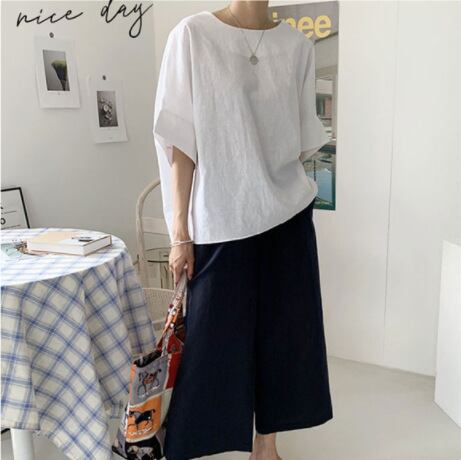 半袖のラウンドネックとサイドスリットが程よい抜け感を演出し、軽やかな印象を与えます。