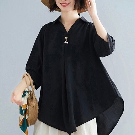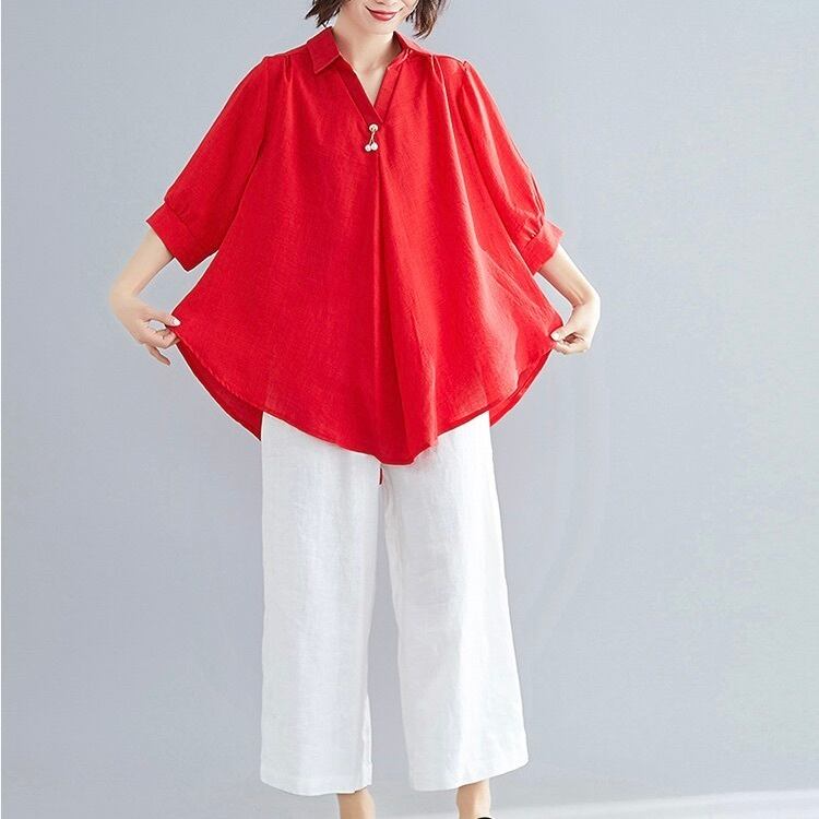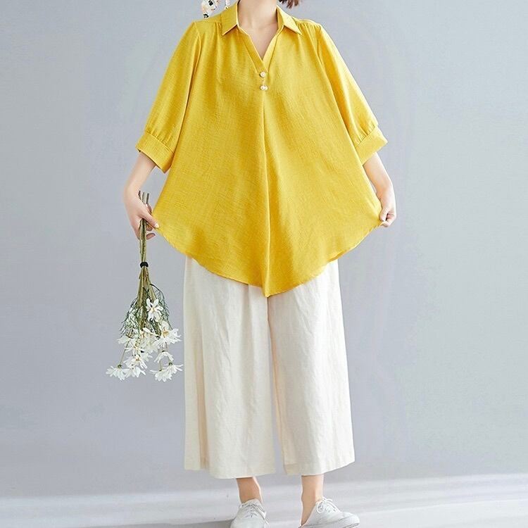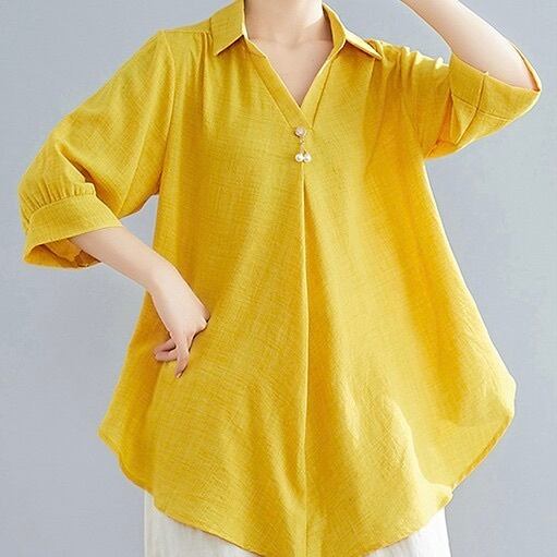 レディース トップス シャツ ブラウス プルオーバー 5分袖 7分袖 Vネック フレア Aライン オーバーサイズ 裾ワイド フェミニン 薄手 リネン 綿 異素材ミックス コットン 麻 かわいい 大人可愛い きれいめ シンプル カジュアル 上品 おしゃれ レトロ アジアン エスニック エキゾチック こなれ感 抜け感 キュート 無地 春 夏 お出かけ 休日 バカンス 楽ちん トレンド 流行 インスタ映え M L XL 2XL 大きいサイズ ゆったり ゆる 白 ホワイト 黒 ブラック 黄色 イエロー レッド