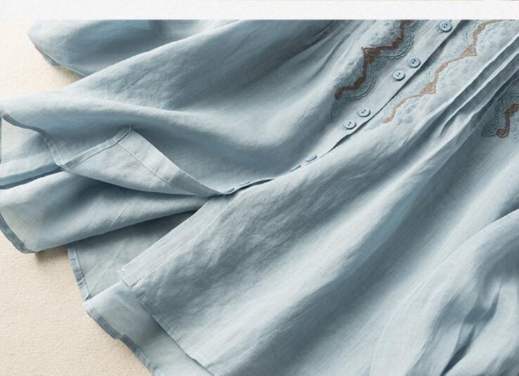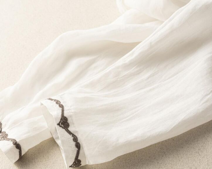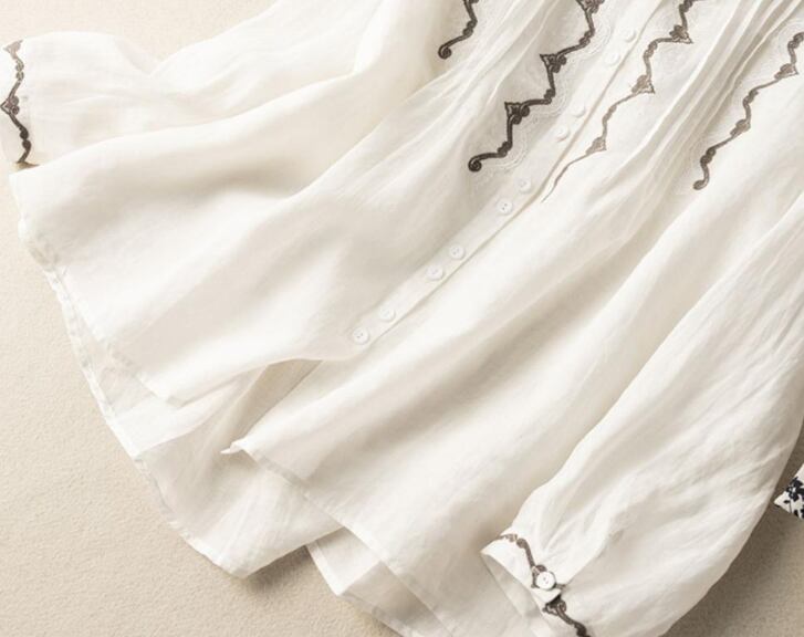 ナチュラルなリネン素材と繊細な刺繍が魅力の長袖ブラウス。