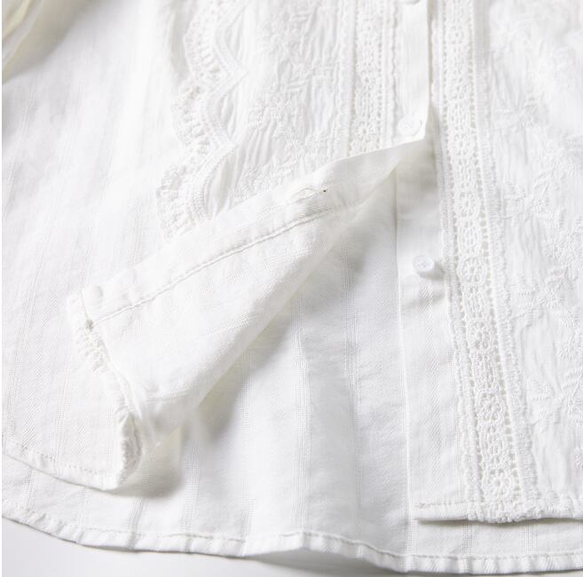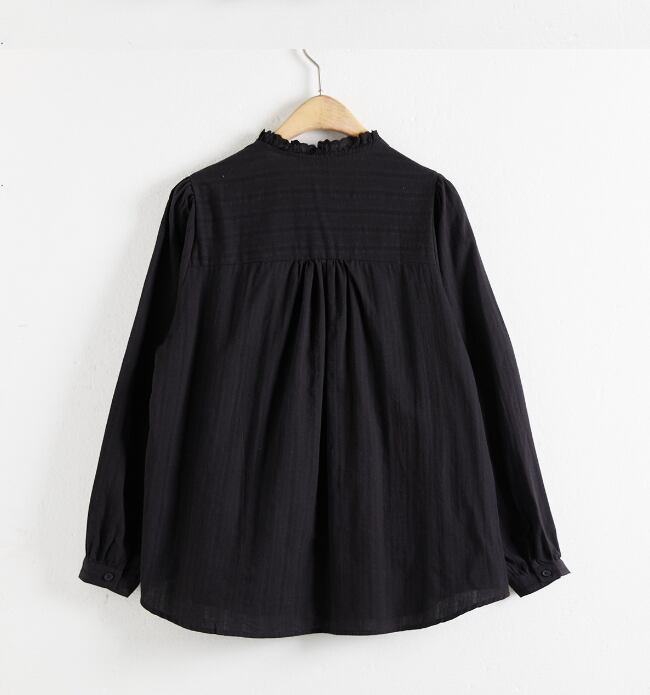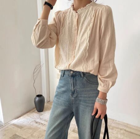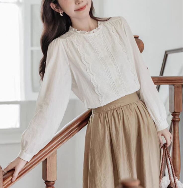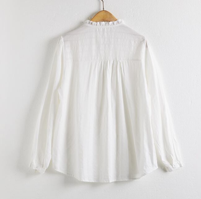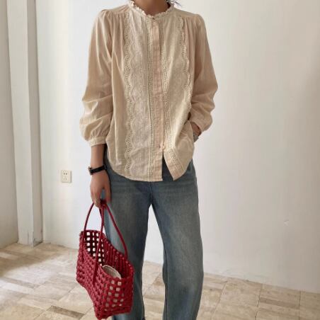 繊細な刺繍が映える襟なしデザインのブラウス。