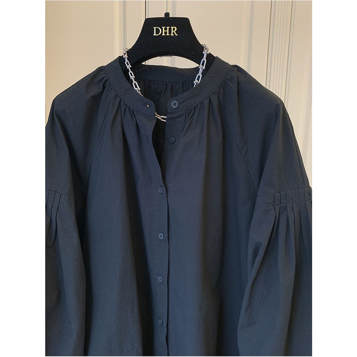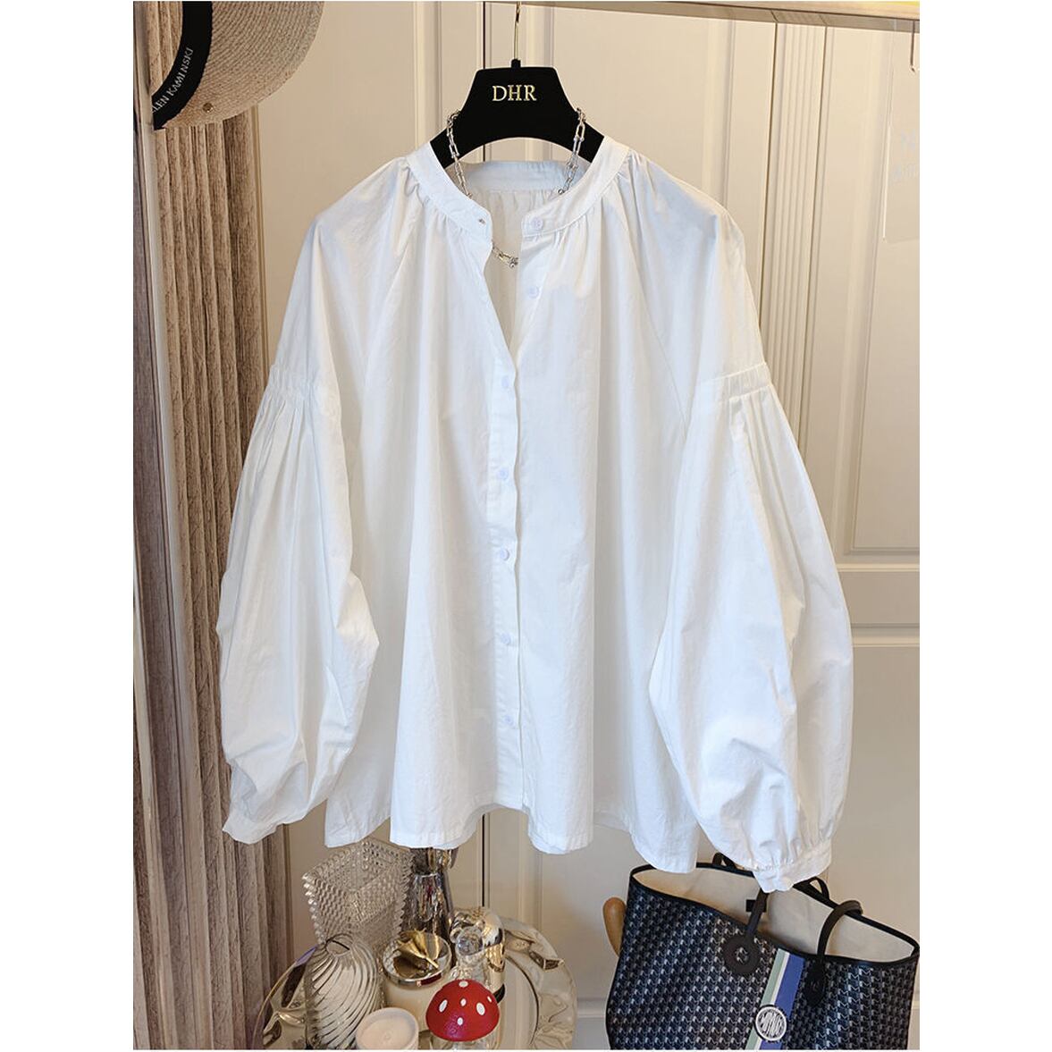 ゆったりしたオーバーシルエット、袖のギャザープリーツとボリュームが目を惹く、どんなシーンにも使える、ビッグノーカラーシャツシャツ。