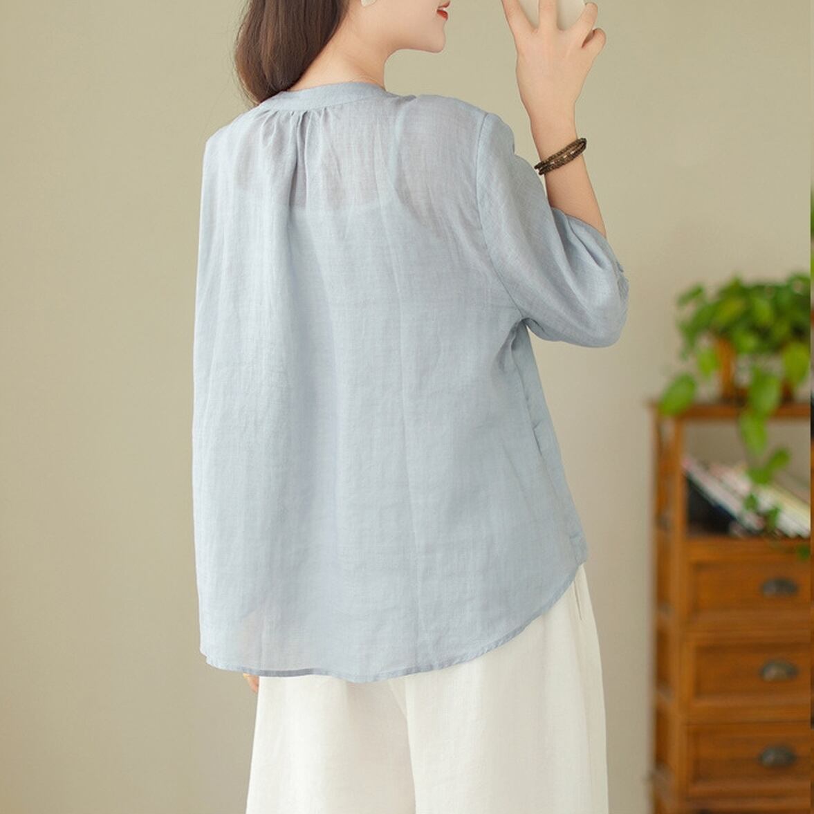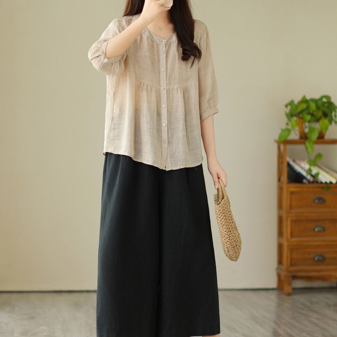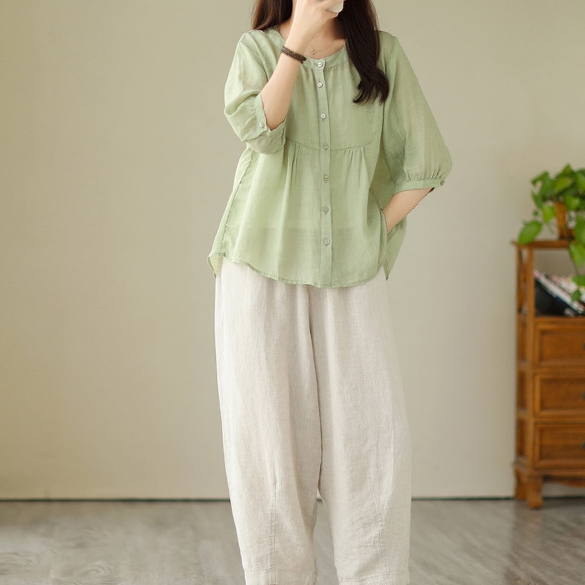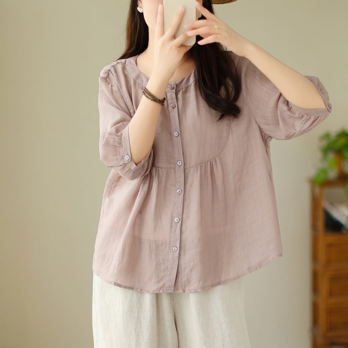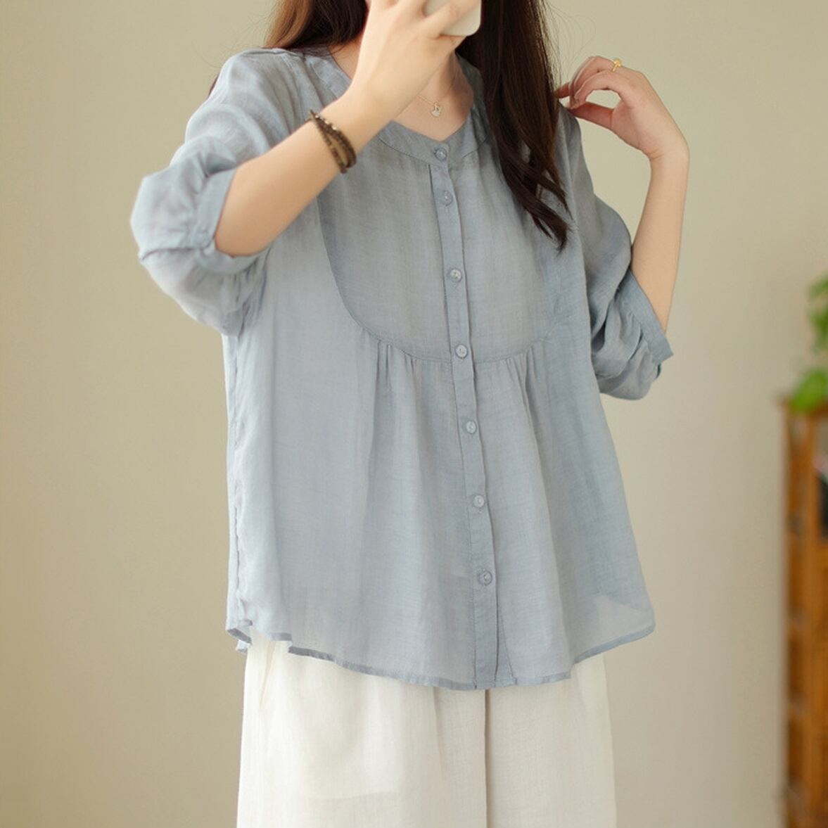 余裕のあるラウンドネックのノーカラー、ほんのり透ける素材感、ふんわりしたシルエット、ガーリーなシアーシャツブラウス。