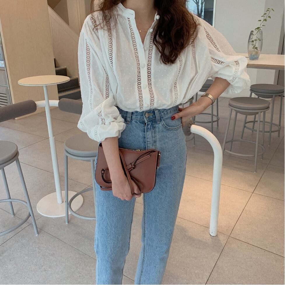 カットワークレースとドットのコンビネーションデザイン、すっきりしたキーネックのシャツブラウス。カジュアルなのに品よくキレイめなのに親しみやすい絶妙なさじ加減のコーディネート。心地良さはそのままにシルエットは美しく。ON・OFFタイム兼用の新名品