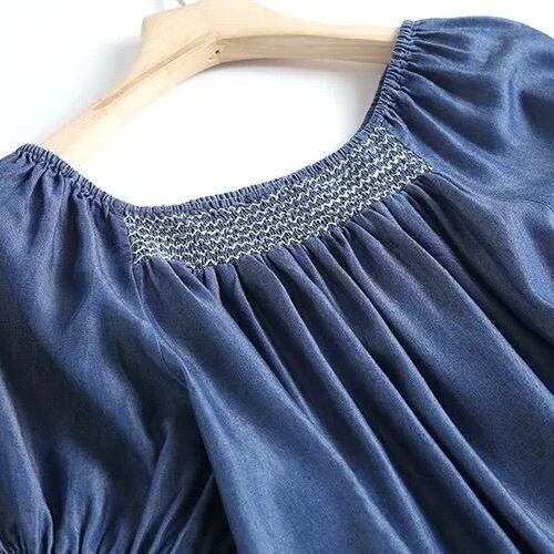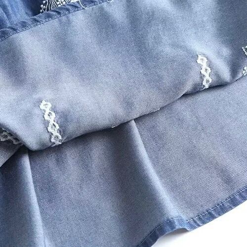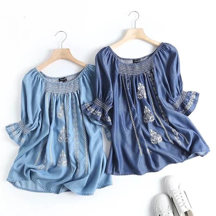 レディース トップス シャツ ブラウス カットソー プルオーバー デニム 半袖 フリル袖 ラウンドネック フェミニン ストリート 刺繍 ヴィンテージ ギャザー ブルーデニム かわいい 大人可愛い きれいめ シンプル カジュアル 上品 おしゃれ かっこいい レトロ こなれ感 ラフ ガーリー 抜け感 ラブリー アクティブ ロマンティック ナチュラル デート お出かけ イベント リゾート 旅行 休日 バカンス ライブ フェス 楽ちん 普段使い 着回し トレンド 流行 インスタ映え M L 水色 ブルー 青色