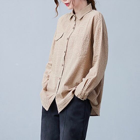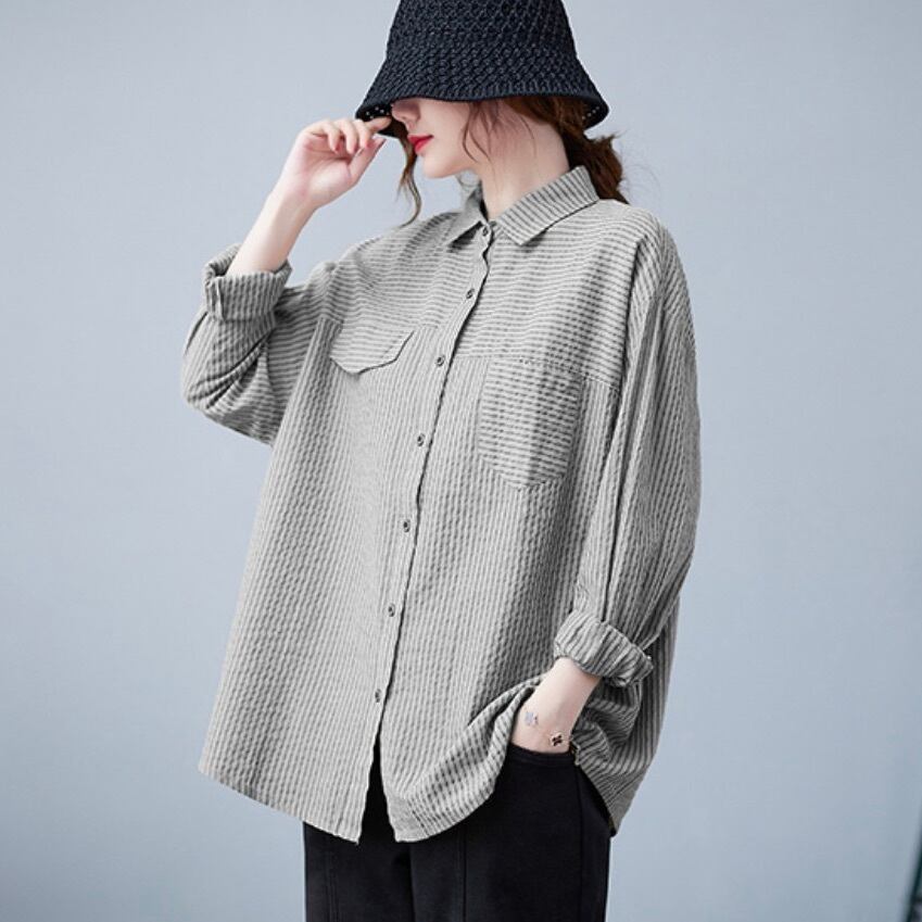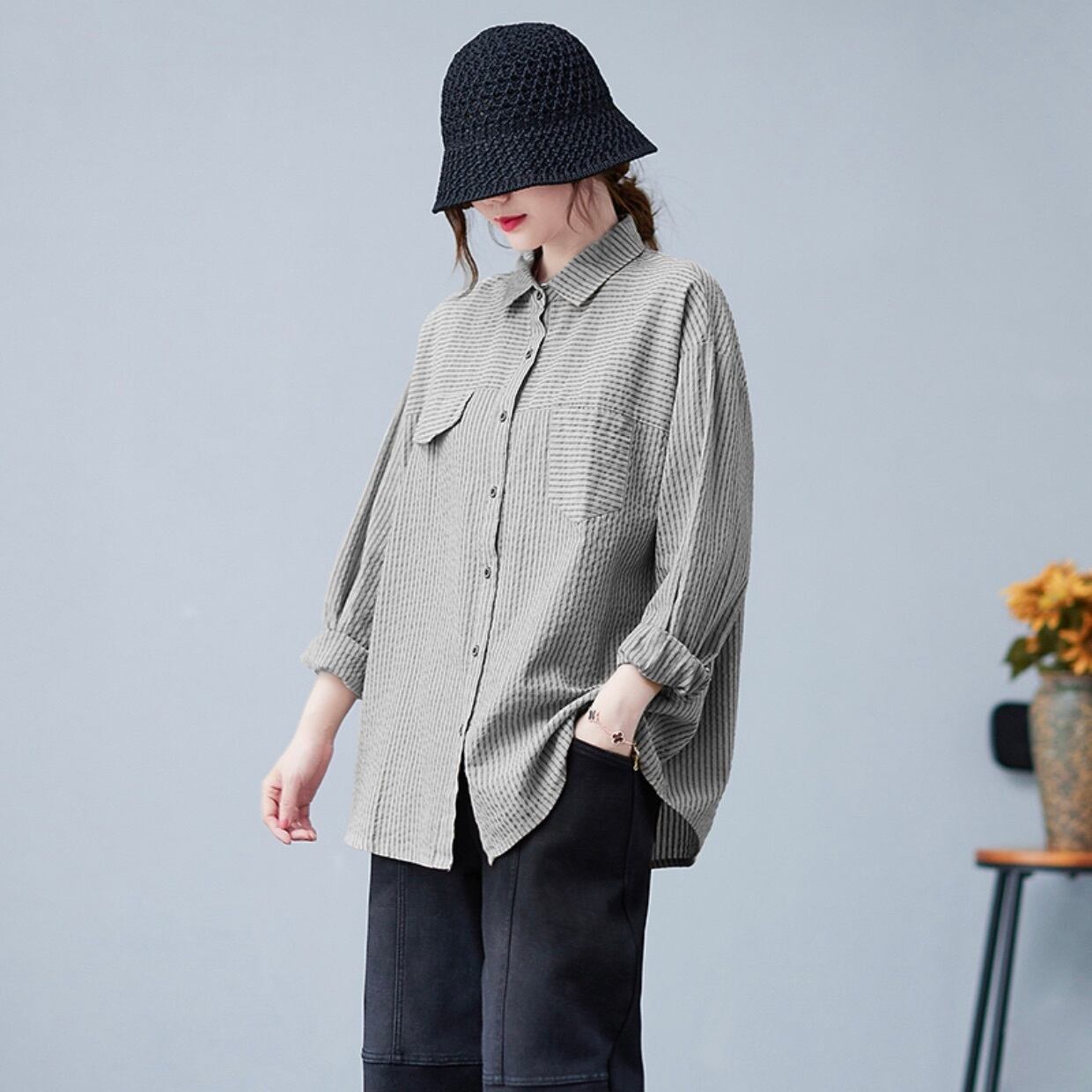 レディース トップス シャツ ブラウス 長袖 Vネック 襟付き 角襟 アシンメトリー ストリート ポケット ヴィンテージ アメカジ かわいい 大人可愛い きれいめ シンプル カジュアル おしゃれ かっこいい レトロ こなれ感 ラフ メンズライク マニッシュ ストライプ 春 秋 お出かけ 旅行 公園 女子会 休日 カフェ 重ね着 韓国 オルチャン 楽ちん 体型カバー 普段使い 着回し レイヤード トレンド 流行 インスタ映え M L XL 2XL 大きいサイズ ビッグ ゆったり ゆる 茶色 ブラウン グレー
