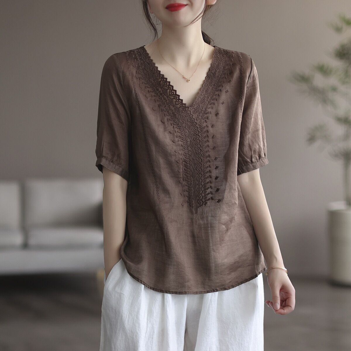 トップス シャツ ブラウス 半袖 Vネック プルオーバー ショート丈 刺繡 透け感 薄手 大人可愛い きれいめ シンプル 上品 おしゃれ かっこいい カジュアル こなれ感 個性的 ラフ 主役級 存在感 抜け感 春 夏 ベーシック ナチュラル クール 無地 女性用 レディース ママ OL 通勤 オフィス 学生 通学 デート お出かけ お泊まり 女子会 旅行 アウトドア 休日 カフェ ショッピング イベント コンパ 普段使い デイリー 着回し 重ね着 S M L XL 2XL トレンド モテ 楽ちん