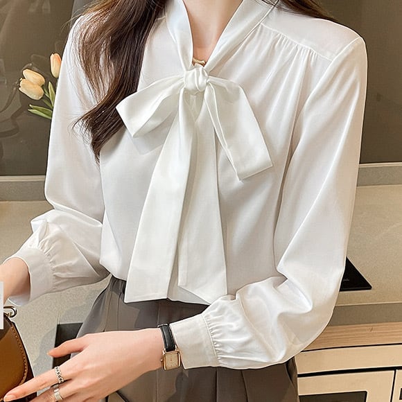 エレガントフェミニンなスタイルにオススメなボウタイブラウスシャツ。