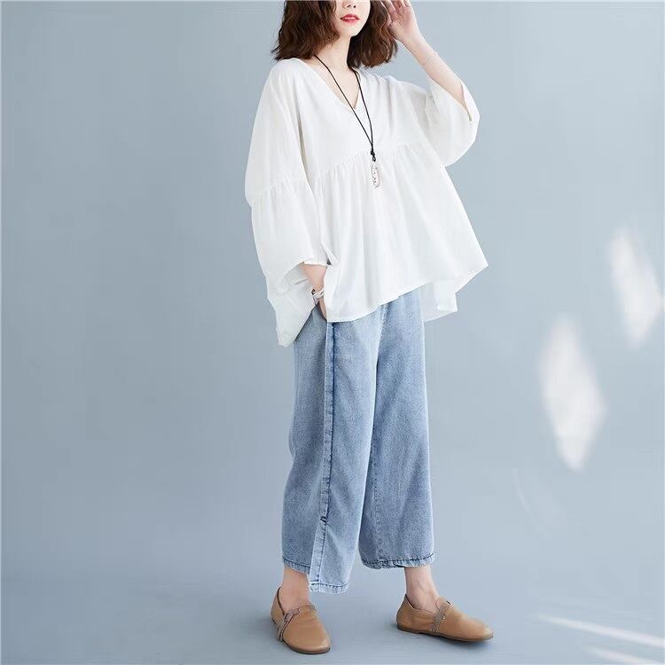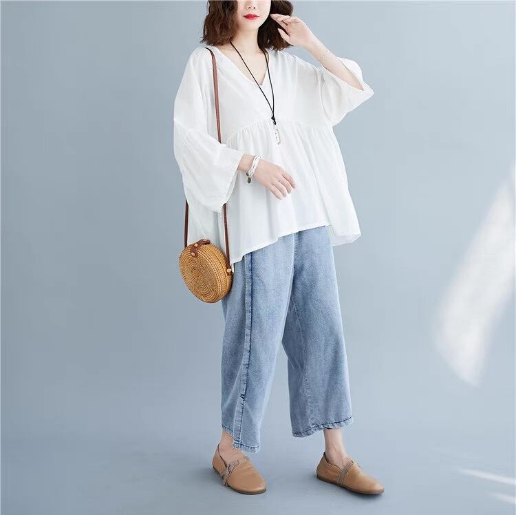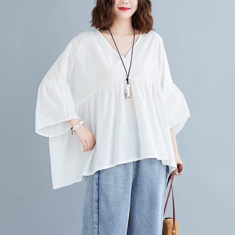 レディース トップス シャツ ブラウス プルオーバー 7分袖 ベルスリーブ Vネック フェミニン ストリート プリーツ タック タックプリーツ ハイウエスト 薄手 かわいい 大人可愛い きれいめ シンプル おしゃれ こなれ感 ガーリー クール エレガント 抜け感 ヴィンテージ ラブリー キュート クラシカル ベーシック ロマンティック ナチュラル 無地 春 秋 デート お出かけ 旅行 休日 バカンス 韓国 オルチャン 楽ちん トレンド 流行 インスタ映え 定番 ゆったり ゆる フリーサイズ 白 ホワイト