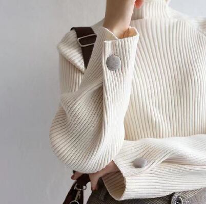 存在感のあるハイネック&襟付きデザインが目を惹くニットプルオーバー。