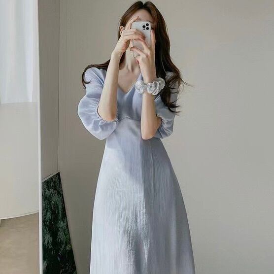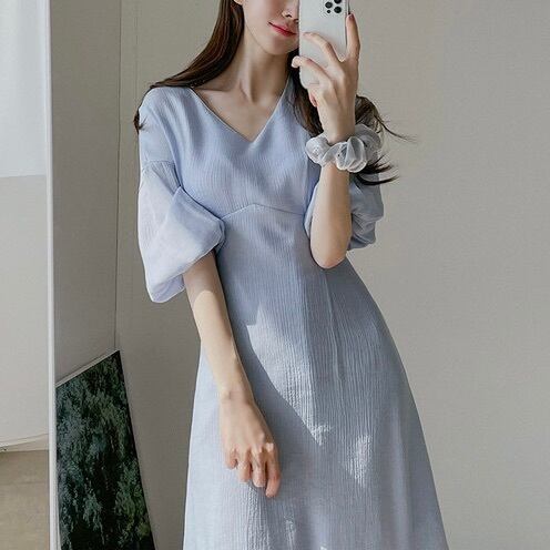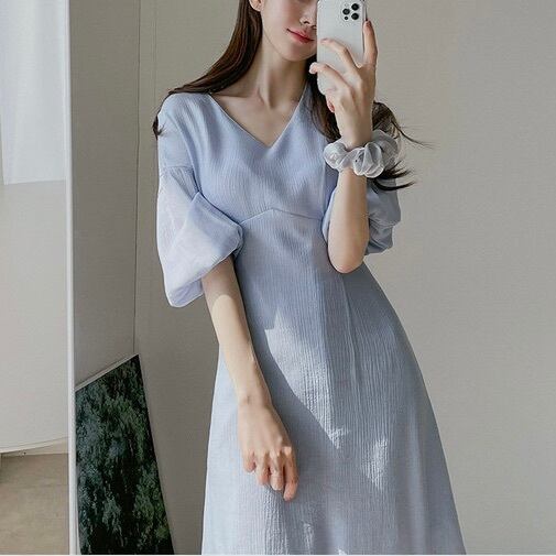 レディース ワンピース フレア ロング マキシ 5分袖 ボリューム袖 バルーン袖 Vネック スリム Aライン シフォン ウエストマーク ウエストリボン バックリボン ハイウエスト かわいい 大人可愛い きれいめ シンプル 上品 おしゃれ ガーリー エレガント 存在感 ラブリー キュート クラシカル ロマンティック ナチュラル 無地 春 夏 デート お出かけ イベント 休日 韓国 オルチャン 清楚 トレンド 流行 インスタ映え 定番 S M L XL 小さいサイズ 大きいサイズ 白 ホワイト 水色 ブルー