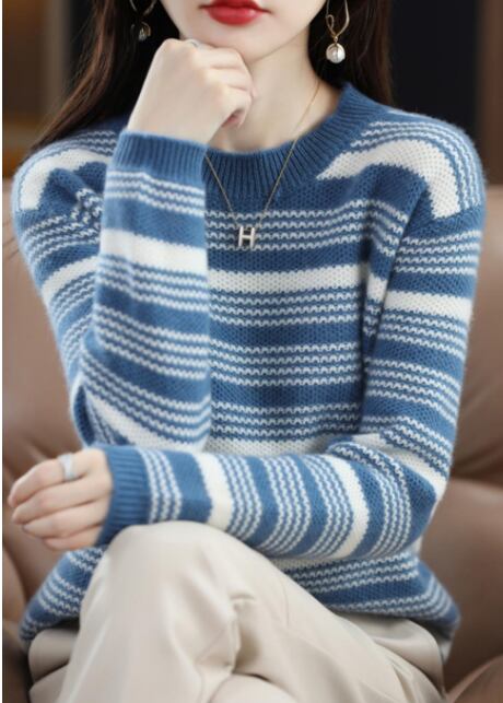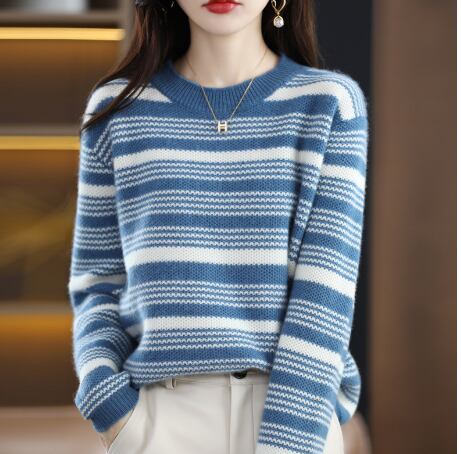 洗練されたボーダーデザインが目を引く、クルーネックのニット。