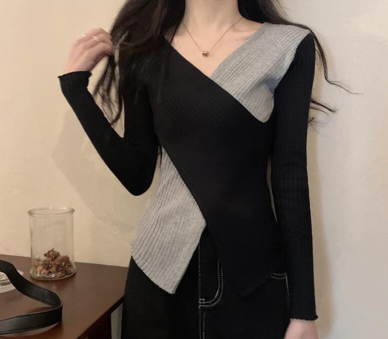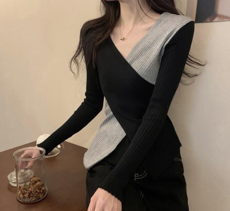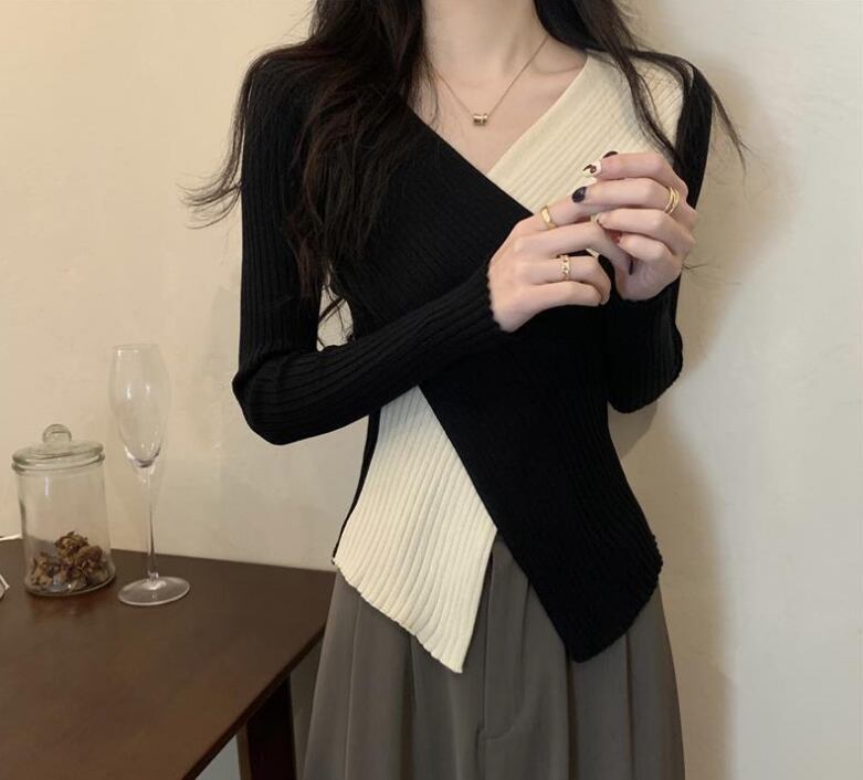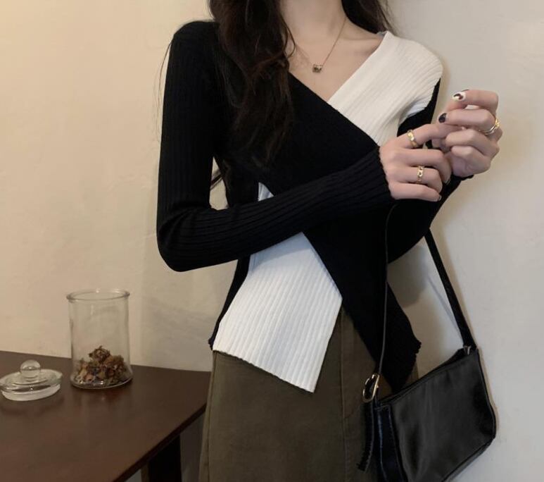 スッキリとしたVネックが魅せる、細見えシルエットのニットトップス。