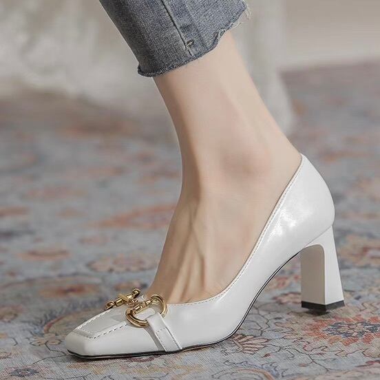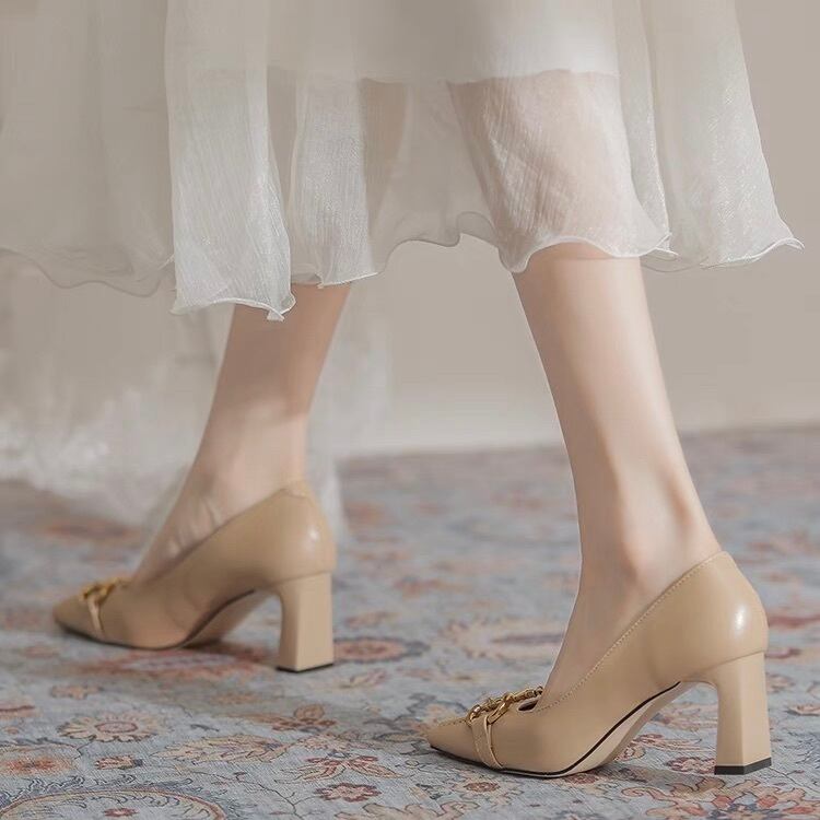スクエアトゥ×太ヒールでモードに美脚見せ。