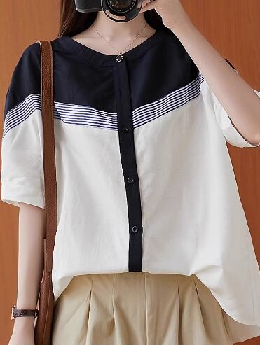 レディース トップス シャツ ブラウス 普通丈 半袖 クルーネック 襟なし ワイド 前開き バイカラー 配色 ボタン 高見え 薄手 きれいめ シンプル カジュアル 上品 おしゃれ こなれ感 ラフ 個性的 クール モード系 モダン 主役級 存在感 都会的 ベーシック ナチュラル 春 夏 デート お出かけ 女子会 休日 ショッピング カフェ オルチャン コーデ 楽ちん 普段使い 着回し モテ 清楚 トレンド 流行 インスタ映え 定番 ゆったり フリーサイズ ワンサイズ ベーシックカラー 大人カラー