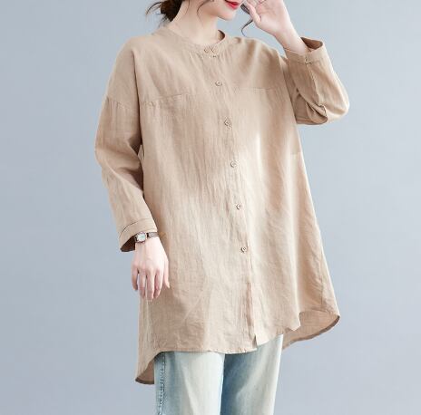 レディース トップス シャツ 丈長 長袖 クルーネック 襟なし ワイド 前開き ボタン 高見え 薄手 きれいめ シンプル カジュアル 上品 おしゃれ レトロ こなれ感 ラフ 個性的 クール モード系 モダン 主役級 存在感 都会的 ベーシック ナチュラル 無地 春 夏 ロングシーズン デート お出かけ 女子会 休日 ショッピング カフェ コーデ 楽ちん 普段使い 着回し モテ 清楚 トレンド 流行 インスタ映え 定番 M L XL 2XL ゆったり サイズ展開 ベージュ ベーシックカラー 大人カラー
