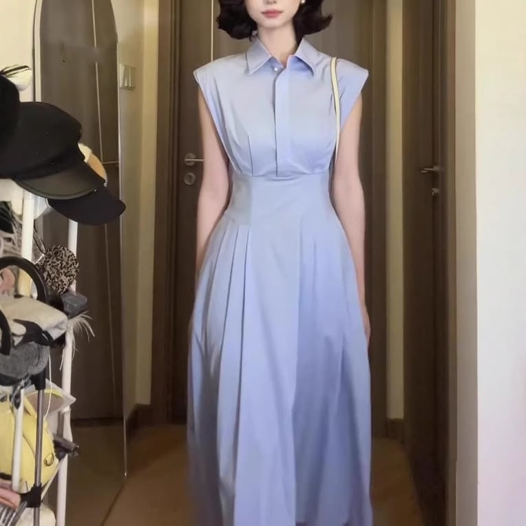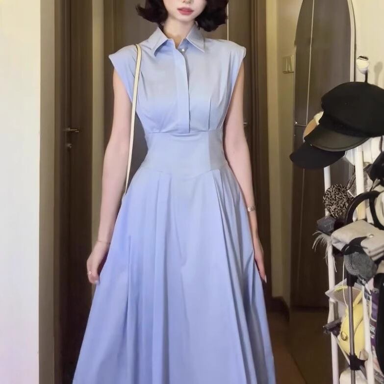 レディース ワンピース ロングスカート ロング ノースリーブ 襟付き ポロカラー スリム Aライン ボタン かわいい 大人可愛い きれいめ シンプル カジュアル 上品 おしゃれ かっこいい アジアン エスニック エキゾチック 個性的 クール モダン 無地 春 夏 秋 オフィス ビジネス OL 通勤 学生 学校 通学 デート お出かけ お泊まり パーティー イベント 旅行 レストラン ビーチ 女子会 休日 バカンス ガーデン コンサート コンパ 韓国 オルチャン モテ インスタ映え S M L XL ブルー