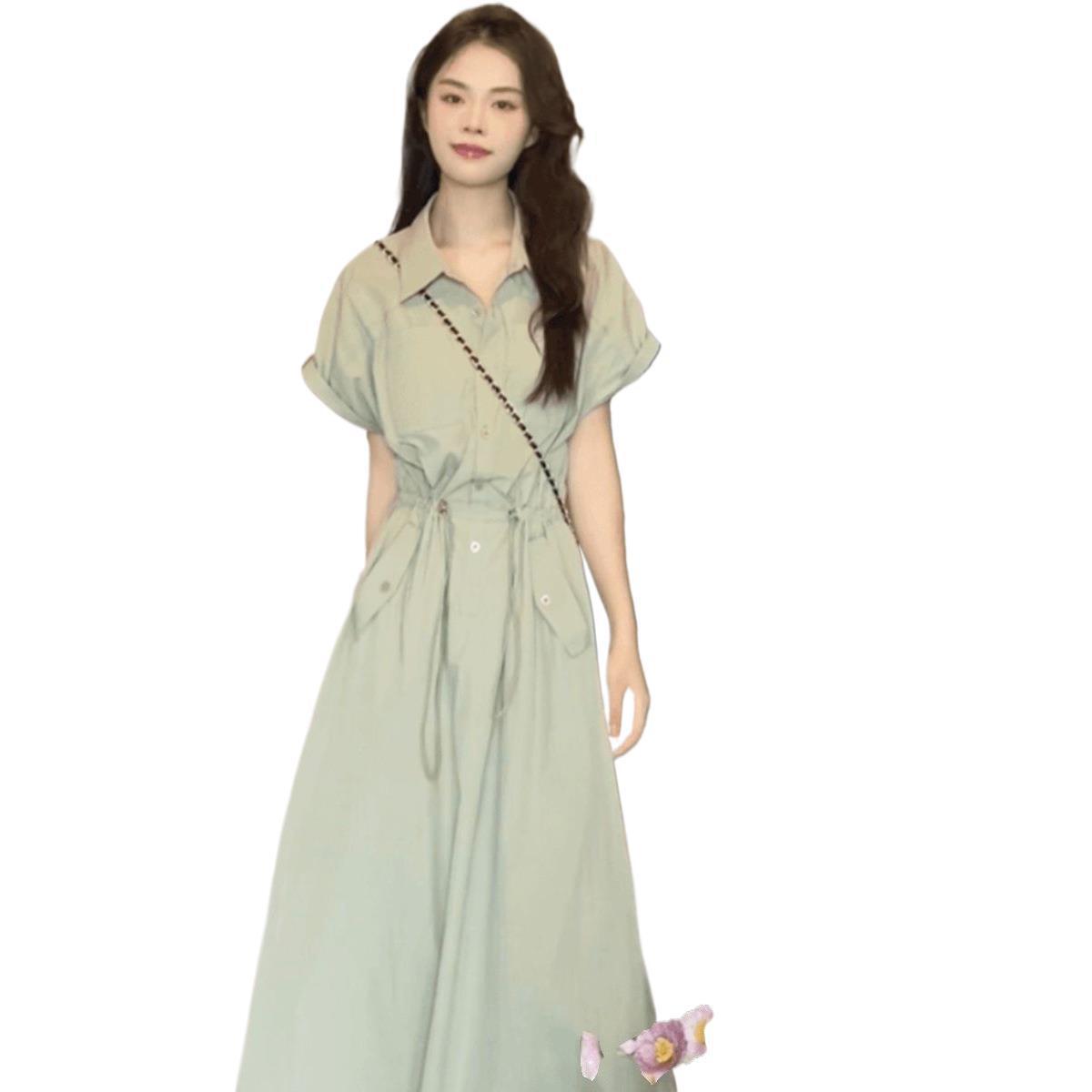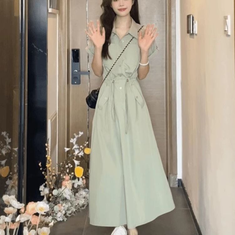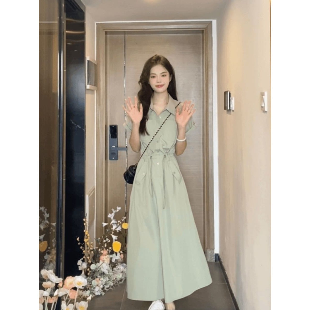レディース ワンピース シャツ ロングスカート ロング 半袖 Vネック ポロカラー セミフレア Aライン かわいい 大人可愛い きれいめ シンプル カジュアル 上品 おしゃれ かっこいい レトロ アジアン エスニック エキゾチック 個性的 無地 春 夏 秋 オフィス ビジネス OL 通勤 学生 学校 通学 デート お出かけ お泊まり パーティー イベント 旅行 レストラン ビーチ 女子会 休日 バカンス ガーデン コンサート コンパ 韓国 オルチャン モテ インスタ映え S M L XL 2XL 緑