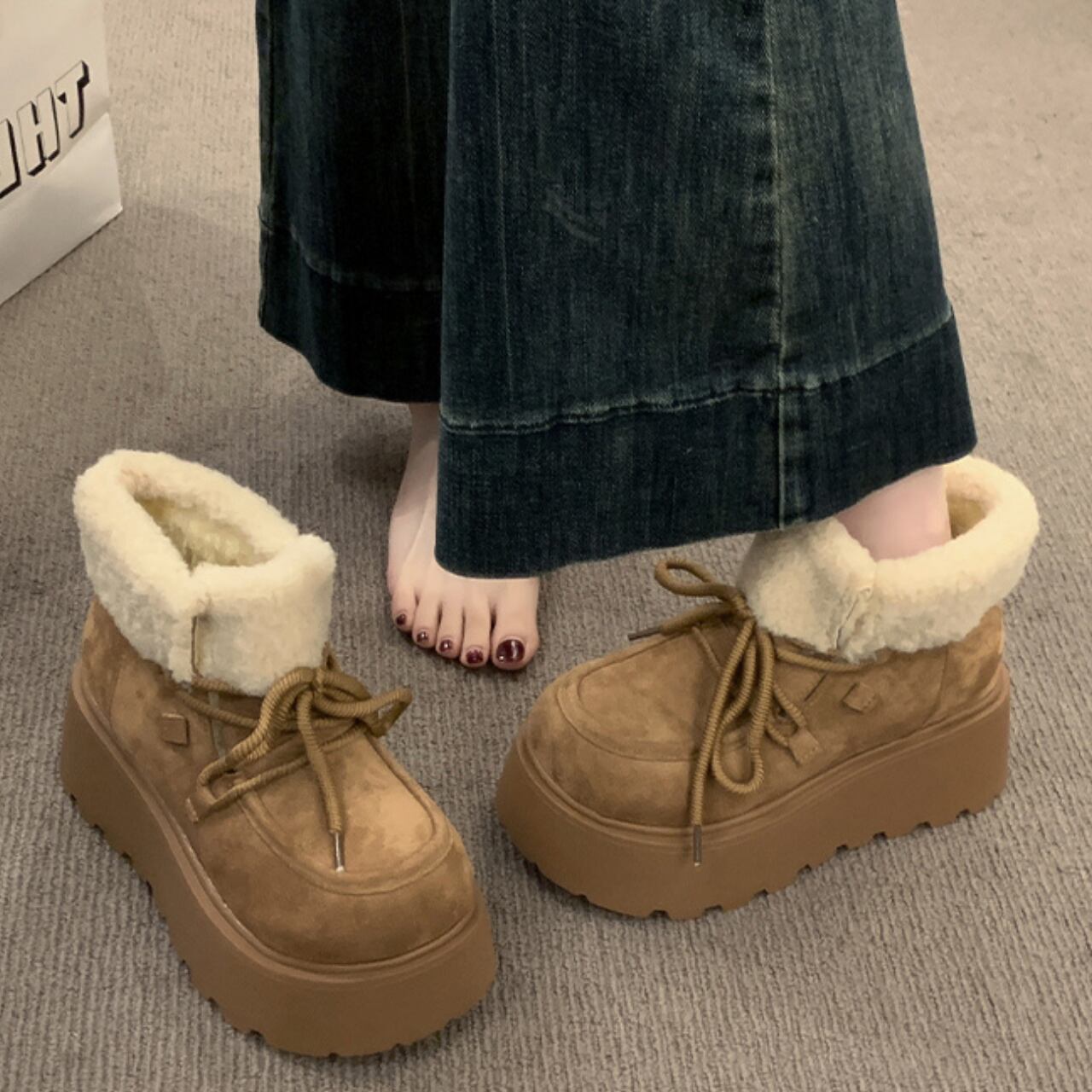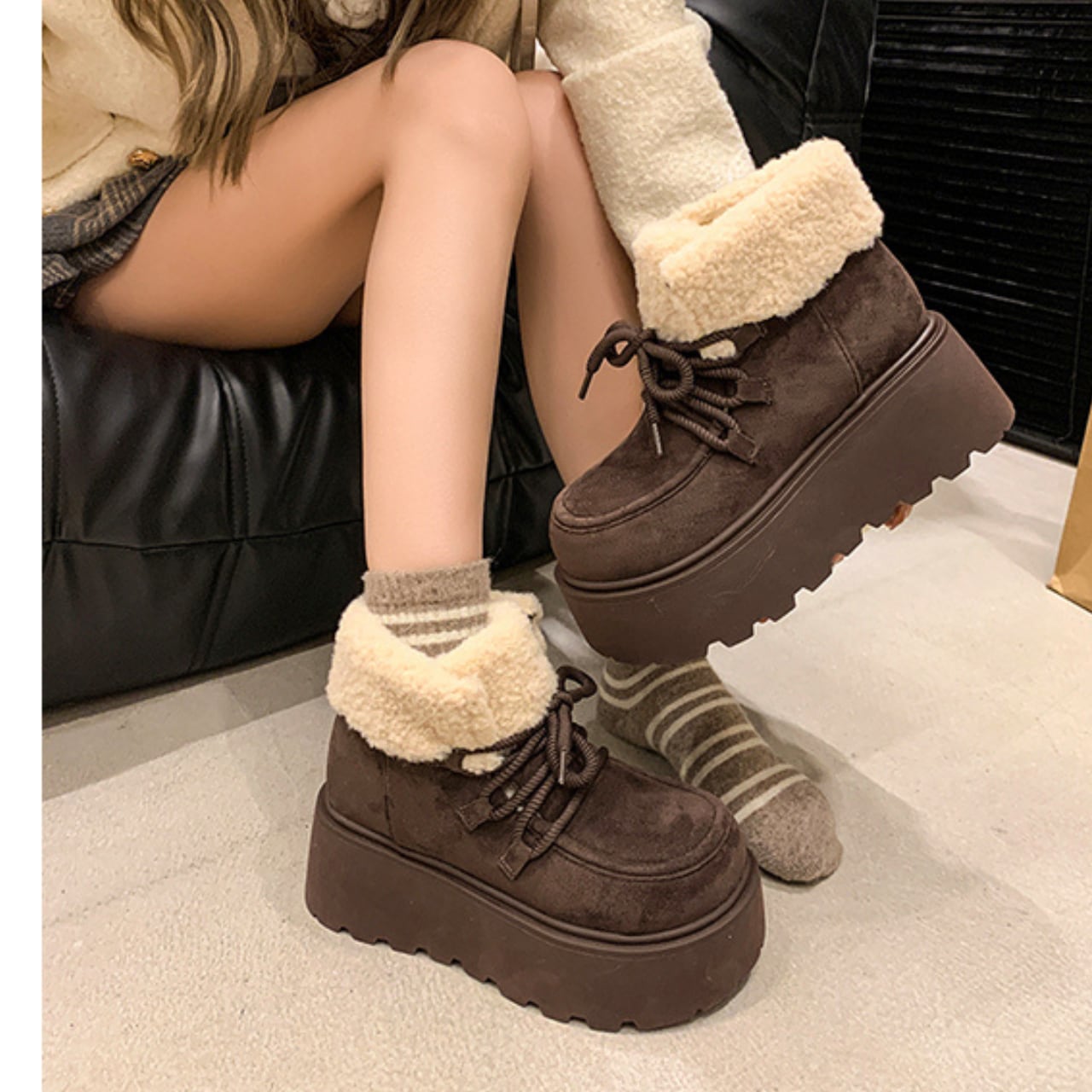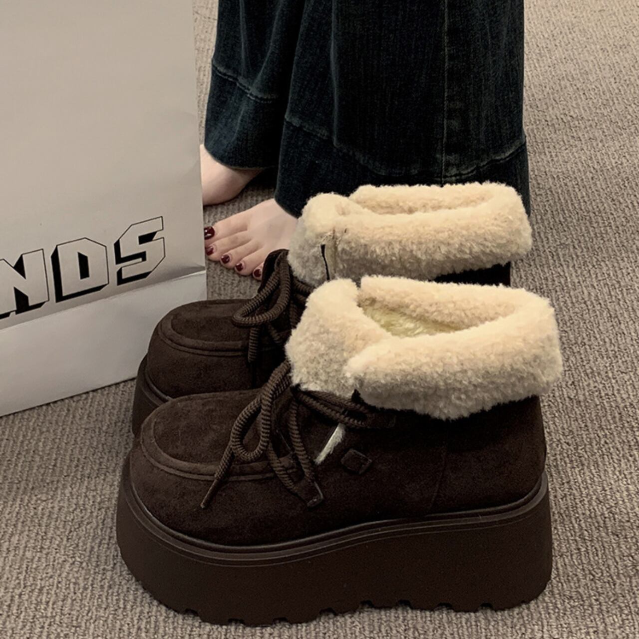 寒い冬にぴったりな「レディース ブーツ ショートブーツ 厚底」!6.5cmの厚底で、もこもこふわふわの柔らかいスウェード素材が、抜群の防寒性とともに足を優しく包み込みます。シンプルながらも上品で、カジュアルからきれいめスタイルまで幅広く活躍するデザイン。通学やデート、お出かけ、アウトドアのシーンでも、あなたのファッションをぐっと引き立ててくれるアイテムです!大人可愛い印象を与えるキャメルとコーヒーの2色展開。ぜひお気に入りのコーディネートに合わせてみてください。