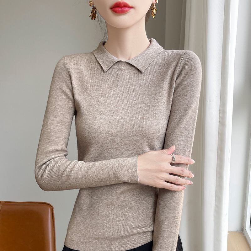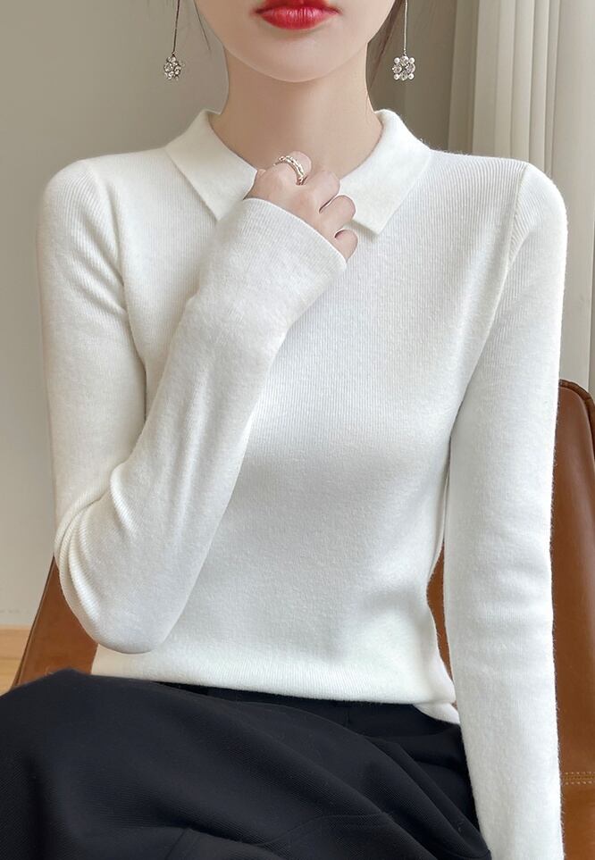 上品でスタイリッシュなデザインが際立つ、長袖の襟付きニットソープルオーバーです。