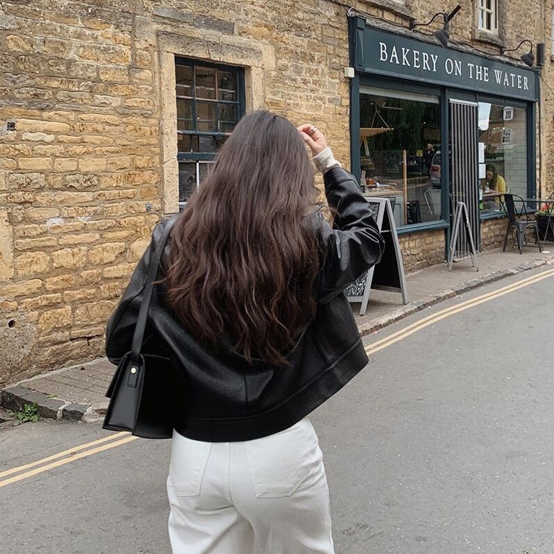 フェイクレザー素材は、かわいさと大人可愛い雰囲気を醸し出しつつ、カジュアルにもきれいめにも着こなせます。